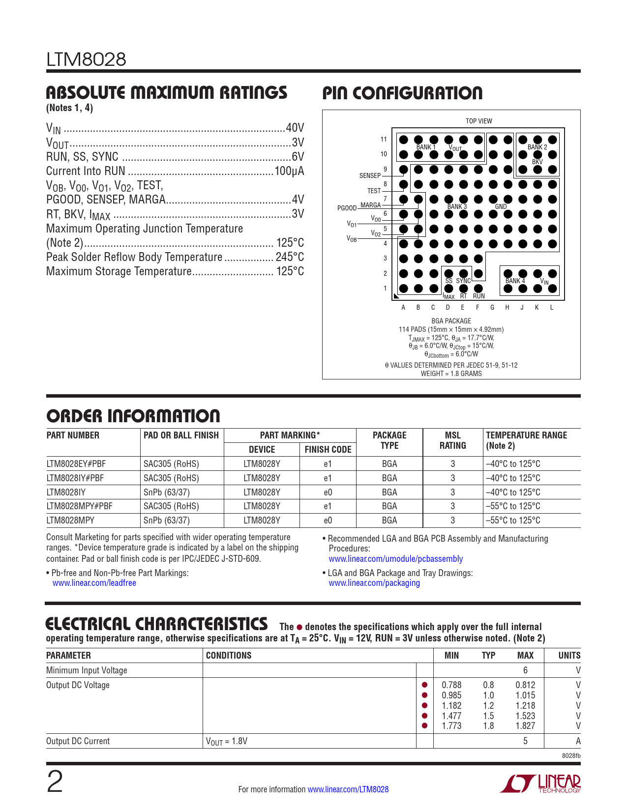 LTM8028 absoluTe MaxiMuM raTingspin conFiguraTion(Notes 1, 4) V TOP VIEW IN ..40V VOUT ..3V 11 BANK 1 VOUT BANK 2 RUN, SS, SYNC ..6V 10 BKV Current Into RUN ..100μA 9 SENSEP VOB, VO0, VO1, VO2, TEST, 8 TEST PGOOD, SENSEP, MARGA ...4V 7 MARGA RT, BKV, I BANK 3 GND PGOOD MAX ...3V 6 VO0 Maximum Operating Junction Temperature VO1 5 VO2 (Note 2) ... 125°C VOB 4 Peak Solder Reflow Body Temperature ... 245°C 3 Maximum Storage Temperature .. 125°C 2 SS SYNC BANK 4 VIN 1 IMAX RT RUN A B C D E F G H J K L BGA PACKAGE 114 PADS (15mm × 15mm × 4.92mm) TJMAX = 125°C, θJA = 17.7°C/W, θJB = 6.0°C/W, θJCtop = 15°C/W, θJCbottom = 6.0°C/W θ VALUES DETERMINED PER JEDEC 51-9, 51-12 WEIGHT = 1.8 GRAMS orDer inForMaTionPART NUMBERPAD OR BALL FINISHPART MARKING*PACKAGEMSLTEMPERATURE RANGETYPERATING(Note 2)DEVICEFINISH CODE LTM8028EY#PBF SAC305 (RoHS) LTM8028Y e1 BGA 3 –40°C to 125°C LTM8028IY#PBF SAC305 (RoHS) LTM8028Y e1 BGA 3 –40°C to 125°C LTM8028IY SnPb (63/37) LTM8028Y e0 BGA 3 –40°C to 125°C LTM8028MPY#PBF SAC305 (RoHS) LTM8028Y e1 BGA 3 –55°C to 125°C LTM8028MPY SnPb (63/37) LTM8028Y e0 BGA 3 –55°C to 125°C Consult Marketing for parts specified with wider operating temperature • Recommended LGA and BGA PCB Assembly and Manufacturing ranges. *Device temperature grade is indicated by a label on the shipping Procedures: container. Pad or ball finish code is per IPC/JEDEC J-STD-609. www.linear.com/umodule/pcbassembly • Pb-free and Non-Pb-free Part Markings: • LGA and BGA Package and Tray Drawings: www.linear.com/leadfree www.linear.com/packaging elecTrical characTerisTicsThe l denotes the specifications which apply over the full internaloperating temperature range, otherwise specifications are at TA = 25°C. VIN = 12V, RUN = 3V unless otherwise noted. (Note 2) PARAMETERCONDITIONSMINTYPMAXUNITS Minimum Input Voltage 6 V Output DC Voltage l 0.788 0.8 0.812 V l 0.985 1.0 1.015 V l 1.182 1.2 1.218 V l 1.477 1.5 1.523 V l 1.773 1.8 1.827 V Output DC Current VOUT = 1.8V 5 A 8028fb 2 For more information www.linear.com/LTM8028 Document Outline Features Applications Description Typical Application Absolute Maximum Ratings Pin Configuration Order Information Electrical Characteristics Typical Performance Characteristics Pin Functions Block Diagram Operation Applications Information Typical Applications Package Description Package Photo Revision History Typical Application Related Parts