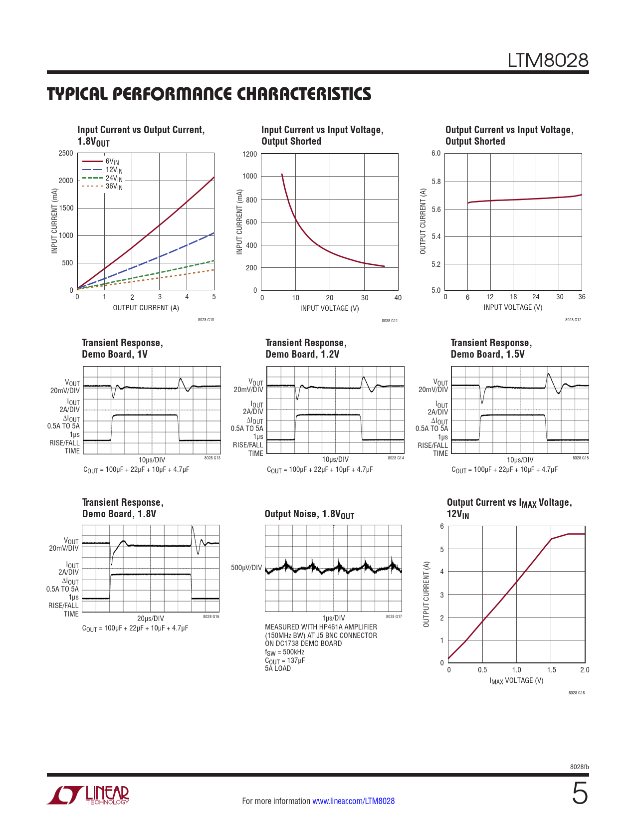 6 VOUT 20mV/DIV 5 IOUT 500µV/DIV 2A/DIV 4 ∆IOUT 0.5A TO 5A 3 1µs RISE/FALL TIME 20µs/DIV 8028 G16 1µs/DIV 8028 G17 2 OUTPUT CURRENT (A) COUT = 100µF + 22µF + 10µF + 4.7µF MEASURED WITH HP461A AMPLIFIER (150MHz BW) AT J5 BNC CONNECTOR 1 ON DC1738 DEMO BOARD fSW = 500kHz COUT = 137µF 0 5A LOAD 0 0.5 1.0 1.5 2.0 IMAX VOLTAGE (V) 8028 G18 8028fb For more information www.linear.com/LTM8028 5 Document Outline Features Applications Description Typical Application Absolute Maximum Ratings Pin Configuration Order Information Electrical Characteristics Typical Performance Characteristics Pin Functions Block Diagram Operation Applications Information Typical Applications Package Description Package Photo Revision History Typical Application Related Parts