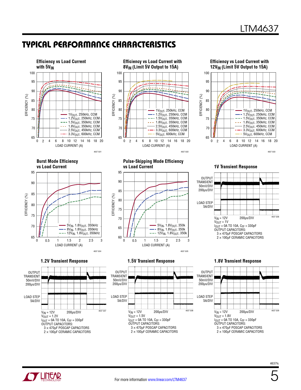 100 100 100 95 95 95 90 90 90 85 85 85 80 80 1VOUT, 250kHz, CCM 80 1VOUT, 250kHz, CCM EFFICIENCY (%) 1VOUT, 250kHz, CCM EFFICIENCY (%) 1.2VOUT, 250kHz, CCM EFFICIENCY (%) 1.2VOUT, 250kHz, CCM 75 1.2VOUT, 250kHz, CCM 75 1.5VOUT, 350kHz, CCM 75 1.5VOUT, 350kHz, CCM 1.5VOUT, 350kHz, CCM 1.8VOUT, 350kHz, CCM 1.8VOUT, 350kHz, CCM 70 1.8VOUT, 350kHz, CCM 2.5VOUT, 450kHz, CCM 2.5VOUT, 450kHz, CCM 2.5V 70 70 OUT, 450kHz, CCM 3.3VOUT, 600kHz, CCM 3.3VOUT, 600kHz, CCM 3.3VOUT, 600kHz, CCM 5VOUT, 600kHz, CCM 5VOUT, 600kHz, CCM 65 65 65 0 2 4 6 8 10 12 14 16 18 20 0 2 4 6 8 10 12 14 16 18 20 0 2 4 6 8 10 12 14 16 18 20 LOAD CURRENT (A) LOAD CURRENT (A) LOAD CURRENT (A) 4637 G01 4637 G02 4637 G03