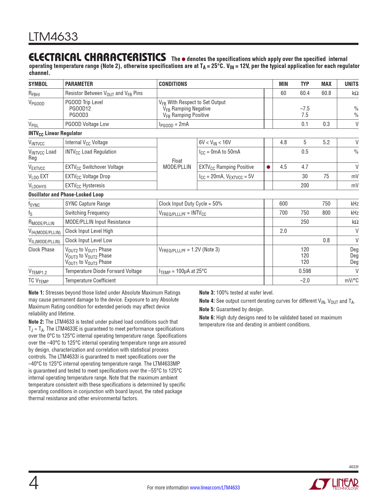 fSYNC SYNC Capture Range Clock Input Duty Cycle = 50% 600 750 kHz fS Switching Frequency VFREQ/PLLLPF = INTVCC 700 750 800 kHz RMODE/PLLIN MODE/PLLIN Input Resistance 250 kΩ VIH(MODE/PLLIN) Clock Input Level High 2.0 V VIL(MODE/PLLIN) Clock Input Level Low 0.8 V Clock Phase VOUT2 to VOUT1 Phase VFREQ/PLLLPF = 1.2V (Note 3) 120 Deg VOUT3 to VOUT2 Phase 120 Deg VOUT1 to VOUT3 Phase 120 Deg VTEMP1,2 Temperature Diode Forward Voltage ITEMP = 100µA at 25°C 0.598 V TC VTEMP Temperature Coefficient –2.0 mV/°C