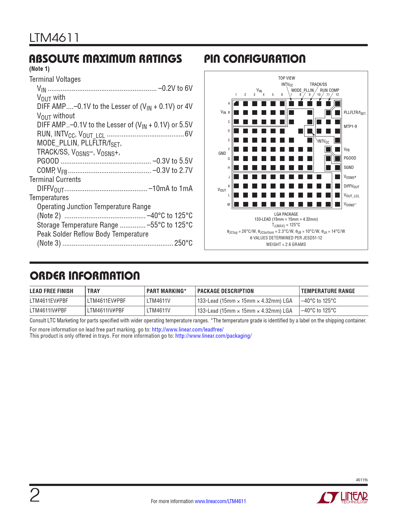 LTM4611EV#PBF LTM4611EV#PBF LTM4611V 133-Lead (15mm × 15mm × 4.32mm) LGA –40°C to 125°C LTM4611IV#PBF LTM4611IV#PBF LTM4611V 133-Lead (15mm × 15mm × 4.32mm) LGA –40°C to 125°C Consult LTC Marketing for parts specified with wider operating temperature ranges. *The temperature grade is identified by a label on the shipping container. For more information on lead free part marking, go to: http:/ www.linear.com/leadfree/ This product is only offered in trays. For more information go to: http:/ www.linear.com/packaging/ 4611fb 2 For more information www.linear.com/LTM4611 Document Outline Features Applications Description Typical Application Absolute Maximum Ratings Pin Configuration Order Information Electrical Characteristics Typical Performance Characteristics Pin Functions Block Diagram Decoupling Requirements Operation Applications Information Typical Applications Package Photograph Package Description Revision History Typical Application Related Parts