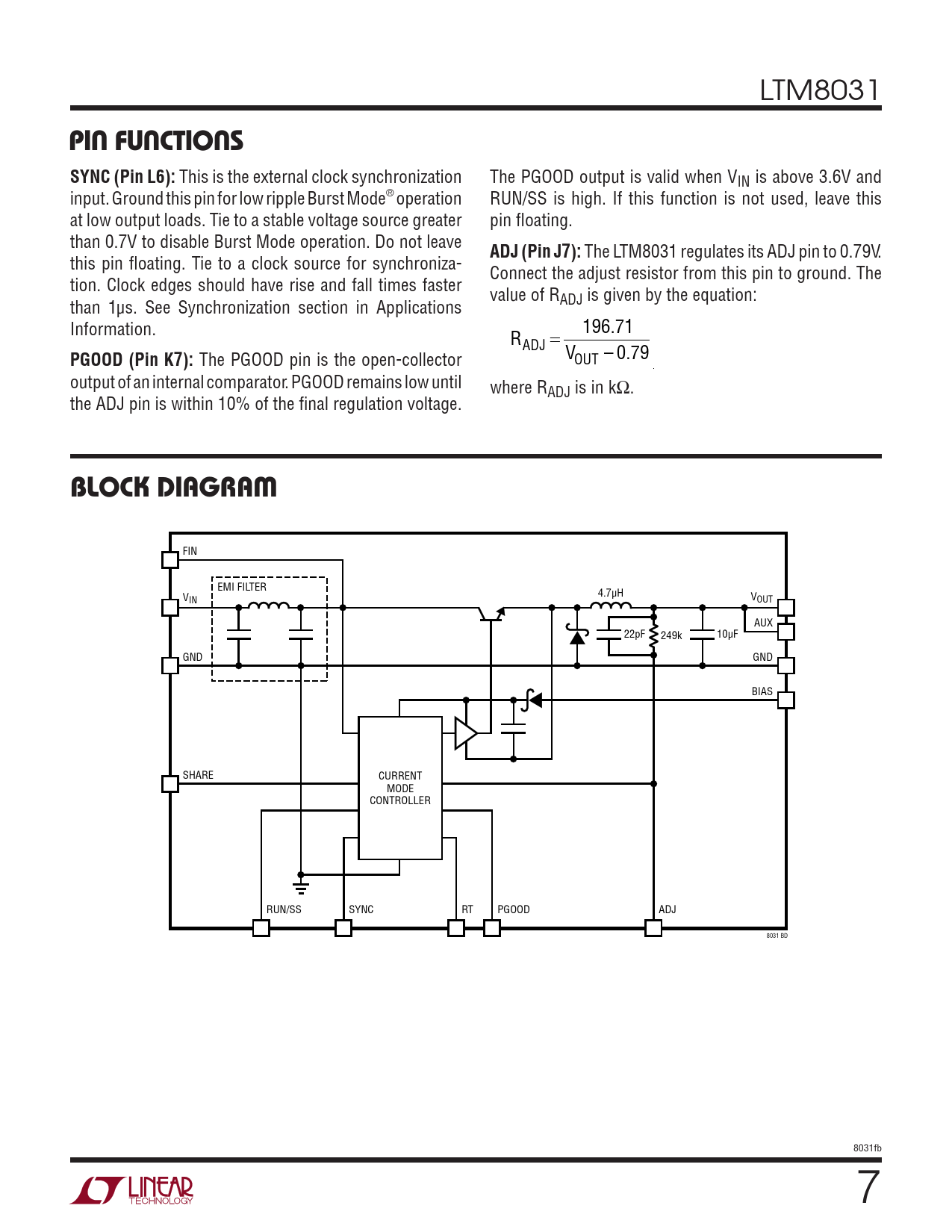 FIN EMI FILTER 4.7µH V V IN OUT AUX 22pF 249k 10µF GND GND BIAS SHARE CURRENT MODE CONTROLLER RUN/SS SYNC RT PGOOD ADJ 8031 BD 8031fb 7 Document Outline Features Applications Description Typical Application Absolute Maximum Ratings Pin Configuration Order Information Electrical Characteristics Typical Performance Characteristics Pin Functions Block Diagram Operation Applications Information Typical Applications Package Description Revision History Typical application Related Parts