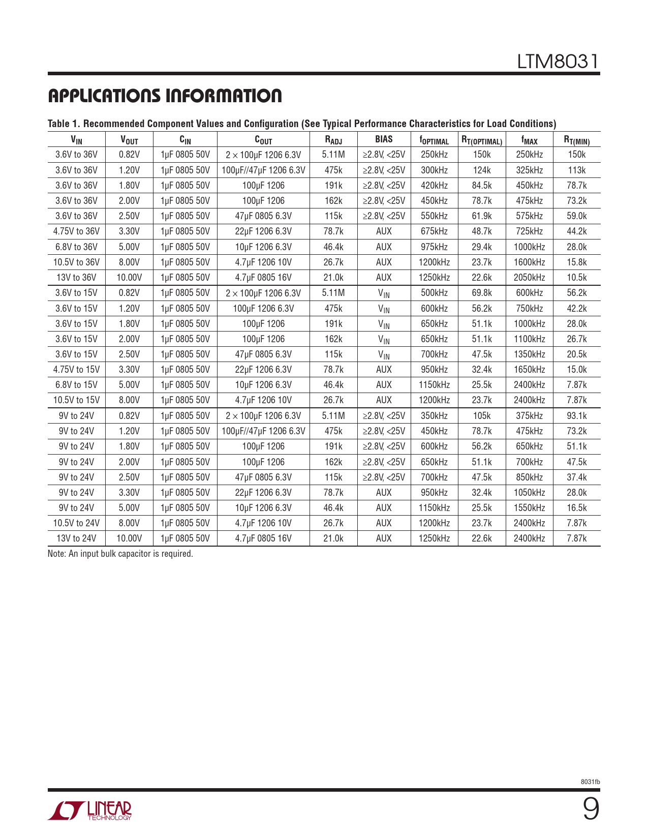 applicaTions inForMaTion Table 1. Recommended Component Values and Configuration (See Typical Performance Characteristics for Load Conditions) VIN VOUT CIN COUT RADJ BIAS fOPTIMAL RT(OPTIMAL) fMAX RT(MIN)