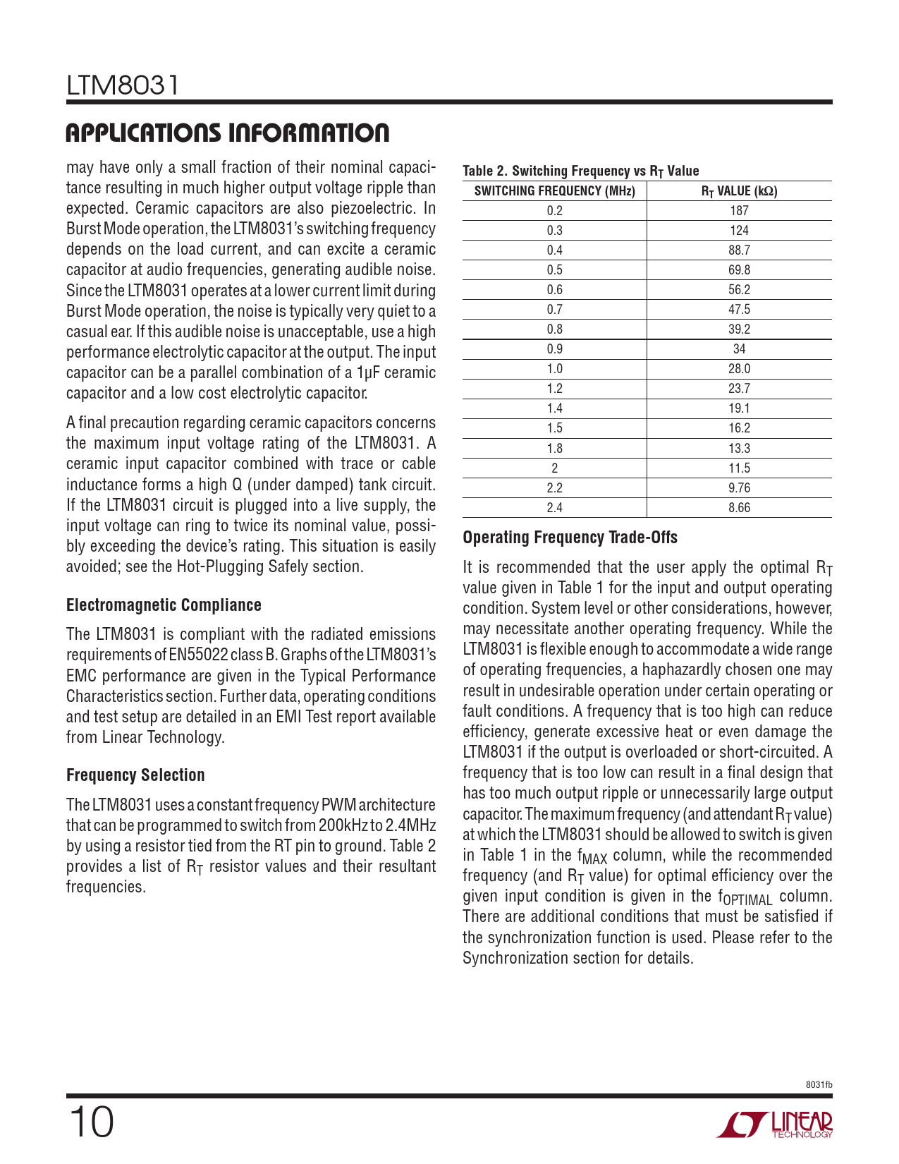 frequency that is too low can result in a final design that has too much output ripple or unnecessarily large output The LTM8031 uses a constant frequency PWM architecture capacitor. The maximum frequency (and attendant R that can be programmed to switch from 200kHz to 2.4MHz T value) at which the LTM8031 should be allowed to switch is given by using a resistor tied from the RT pin to ground. Table 2 in Table 1 in the f provides a list of R MAX column, while the recommended T resistor values and their resultant frequency (and R frequencies. T value) for optimal efficiency over the given input condition is given in the fOPTIMAL column. There are additional conditions that must be satisfied if the synchronization function is used. Please refer to the Synchronization section for details. 8031fb 10 Document Outline Features Applications Description Typical Application Absolute Maximum Ratings Pin Configuration Order Information Electrical Characteristics Typical Performance Characteristics Pin Functions Block Diagram Operation Applications Information Typical Applications Package Description Revision History Typical application Related Parts