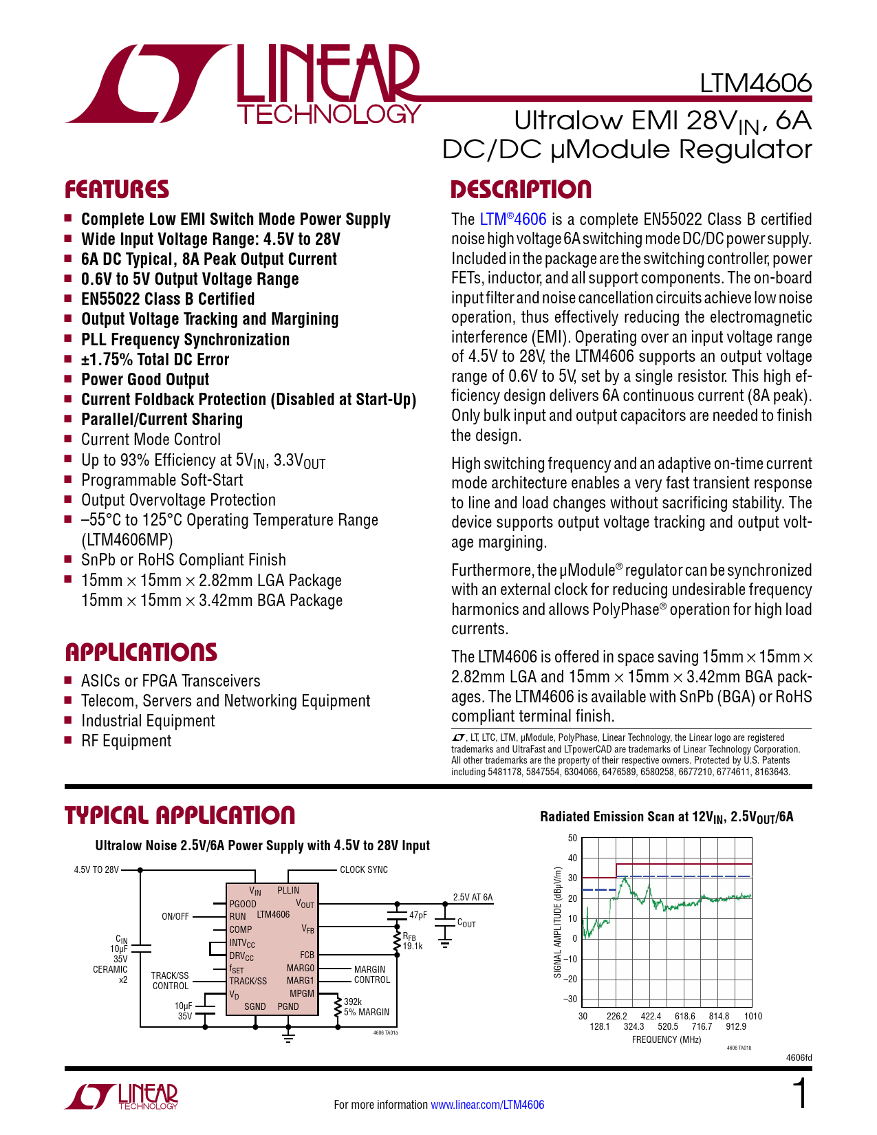 The LTM4606 is offered in space saving 15mm × 15mm × n ASICs or FPGA Transceivers 2.82mm LGA and 15mm × 15mm × 3.42mm BGA pack- n ages. The LTM4606 is available with SnPb (BGA) or RoHS Telecom, Servers and Networking Equipment n compliant terminal finish. Industrial Equipment n RF Equipment L, LT, LTC, LTM, µModule, PolyPhase, Linear Technology, the Linear logo are registered trademarks and UltraFast and LTpowerCAD are trademarks of Linear Technology Corporation. All other trademarks are the property of their respective owners. Protected by U.S. Patents including 5481178, 5847554, 6304066, 6476589, 6580258, 6677210, 6774611, 8163643.