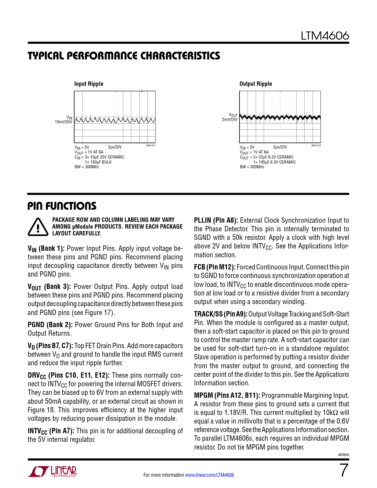 Typical perForMance characTerisTics. Input Ripple. Output Ripple. pin FuncTions. PACKAGE ROW AND COLUMN LABELING MAY VARY