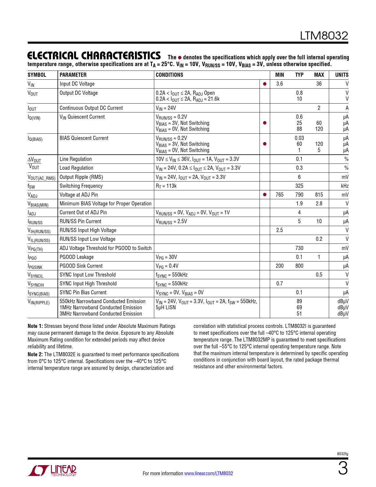VIN Input DC Voltage l 3.6 36 V VOUT Output DC Voltage 0.2A < IOUT ≤ 2A, RADJ Open 0.8 V 0.2A < IOUT ≤ 2A, RADJ = 21.6k 10 V IOUT Continuous Output DC Current VIN = 24V 2 A IQ(VIN) VIN Quiescent Current VRUN/SS = 0.2V 0.6 µA VBIAS = 3V, Not Switching l 25 60 µA VBIAS = 0V, Not Switching 88 120 µA IQ(BIAS) BIAS Quiescent Current VRUN/SS = 0.2V 0.03 µA VBIAS = 3V, Not Switching l 60 120 µA VBIAS = 0V, Not Switching 1 5 µA ∆VOUT Line Regulation 10V ≤ VIN ≤ 36V, IOUT = 1A, VOUT = 3.3V 0.1 % VOUT Load Regulation VIN = 24V, 0.2A ≤ IOUT ≤ 2A, VOUT = 3.3V 0.3 % VOUT(AC_RMS) Output Ripple (RMS) VIN = 24V, IOUT = 2A, VOUT = 3.3V 6 mV fSW Switching Frequency RT = 113k 325 kHz VADJ Voltage at ADJ Pin l 765 790 815 mV VBIAS(MIN) Minimum BIAS Voltage for Proper Operation 1.9 2.8 V IADJ Current Out of ADJ Pin VRUN/SS = 0V, VADJ = 0V, VOUT = 1V 4 µA IRUN/SS RUN/SS Pin Current VRUN/SS = 2.5V 5 10 µA VIH(RUN/SS) RUN/SS Input High Voltage 2.5 V VIL(RUN/SS) RUN/SS Input Low Voltage 0.2 V VPG(TH) ADJ Voltage Threshold for PGOOD to Switch 730 mV IPGO PGOOD Leakage VPG = 30V 0.1 1 µA IPGSINK PGOOD Sink Current VPG = 0.4V 200 800 µA VSYNCIL SYNC Input Low Threshold fSYNC = 550kHz 0.5 V VSYNCIH SYNC Input High Threshold fSYNC = 550kHz 0.7 V ISYNC(BIAS) SYNC Pin Bias Current VSYNC = 0V, VBIAS = 0V 0.1 µA VIN(RIPPLE) 550kHz Narrowband Conducted Emission VIN = 24V, VOUT = 3.3V, IOUT = 2A, fSW = 550kHz, 89 dBµV 1MHz Narrowband Conducted Emission 5µH LISN 69 dBµV 3MHz Narrowband Conducted Emission 51 dBµV