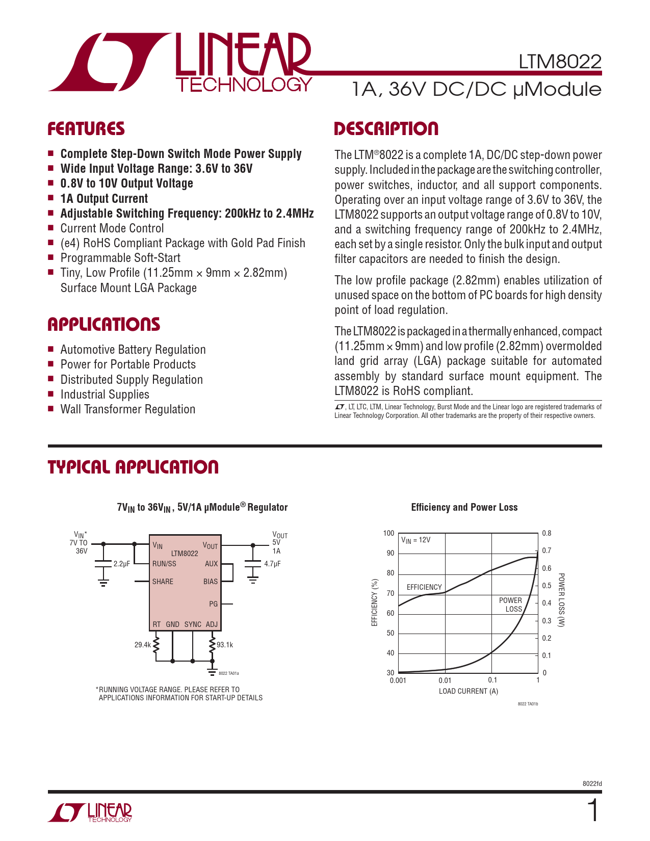 LTM8022 1A, 36V DC/DC µModule FEATURESDESCRIPTION n Complete Step-Down Switch Mode Power Supply The LTM®8022 is a complete 1A, DC/DC step-down power n Wide Input Voltage Range: 3.6V to 36V supply. Included in the package are the switching controller, n 0.8V to 10V Output Voltage power switches, inductor, and all support components. n 1A Output Current Operating over an input voltage range of 3.6V to 36V, the n Adjustable Switching Frequency: 200kHz to 2.4MHz LTM8022 supports an output voltage range of 0.8V to 10V, n Current Mode Control and a switching frequency range of 200kHz to 2.4MHz, n (e4) RoHS Compliant Package with Gold Pad Finish each set by a single resistor. Only the bulk input and output n Programmable Soft-Start fi lter capacitors are needed to fi nish the design. n Tiny, Low Profi le (11.25mm × 9mm × 2.82mm) The low profi le package (2.82mm) enables utilization of Surface Mount LGA Package unused space on the bottom of PC boards for high density point of load regulation. APPLICATIONS The LTM8022 is packaged in a thermally enhanced, compact n (11.25mm × 9mm) and low profi le (2.82mm) overmolded Automotive Battery Regulation n land grid array (LGA) package suitable for automated Power for Portable Products n assembly by standard surface mount equipment. The Distributed Supply Regulation n LTM8022 is RoHS compliant. Industrial Supplies n Wall Transformer Regulation L, LT, LTC, LTM, Linear Technology, Burst Mode and the Linear logo are registered trademarks of Linear Technology Corporation. All other trademarks are the property of their respective owners. TYPICAL APPLICATION7VIN to 36VIN, 5V/1A μModule® RegulatorEffi ciency and Power Loss VIN* VOUT 100 0.8 7V TO 5V V V IN = 12V IN VOUT 36V LTM8022 1A 90 0.7 2.2μF RUN/SS AUX 4.7μF 0.6 80 POWER LOSS (W) SHARE BIAS EFFICIENCY 0.5 70 PG POWER 0.4 LOSS 60 0.3 RT GND SYNC ADJ EFFICIENCY (%) 50 0.2 29.4k 93.1k 40 0.1 8022 TA01a 30 0 0.001 0.01 0.1 1 *RUNNING VOLTAGE RANGE. PLEASE REFER TO LOAD CURRENT (A) APPLICATIONS INFORMATION FOR START-UP DETAILS 8022 TA01b 8022fd 1