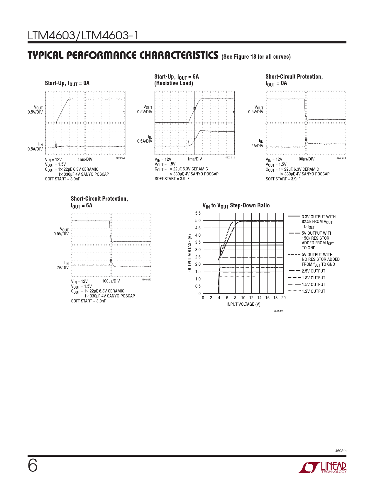 VOUT VOUT VOUT 0.5V/DIV 0.5V/DIV 0.5V/DIV IIN 0.5A/DIV I I IN IN 2A/DIV 0.5A/DIV 1ms/DIV 4603 G09 VIN = 12V 1ms/DIV 4603 G10 VIN = 12V 100µs/DIV 4603 G11 VIN = 12V VOUT = 1.5V VOUT = 1.5V VOUT = 1.5V COUT = 1× 22µF, 6.3V CERAMIC COUT = 1× 22µF, 6.3V CERAMIC COUT = 1× 22µF, 6.3V CERAMIC 1× 330µF, 4V SANYO POSCAP 1× 330µF, 4V SANYO POSCAP 1× 330µF, 4V SANYO POSCAP SOFT-START = 3.9nF SOFT-START = 3.9nF SOFT-START = 3.9nF