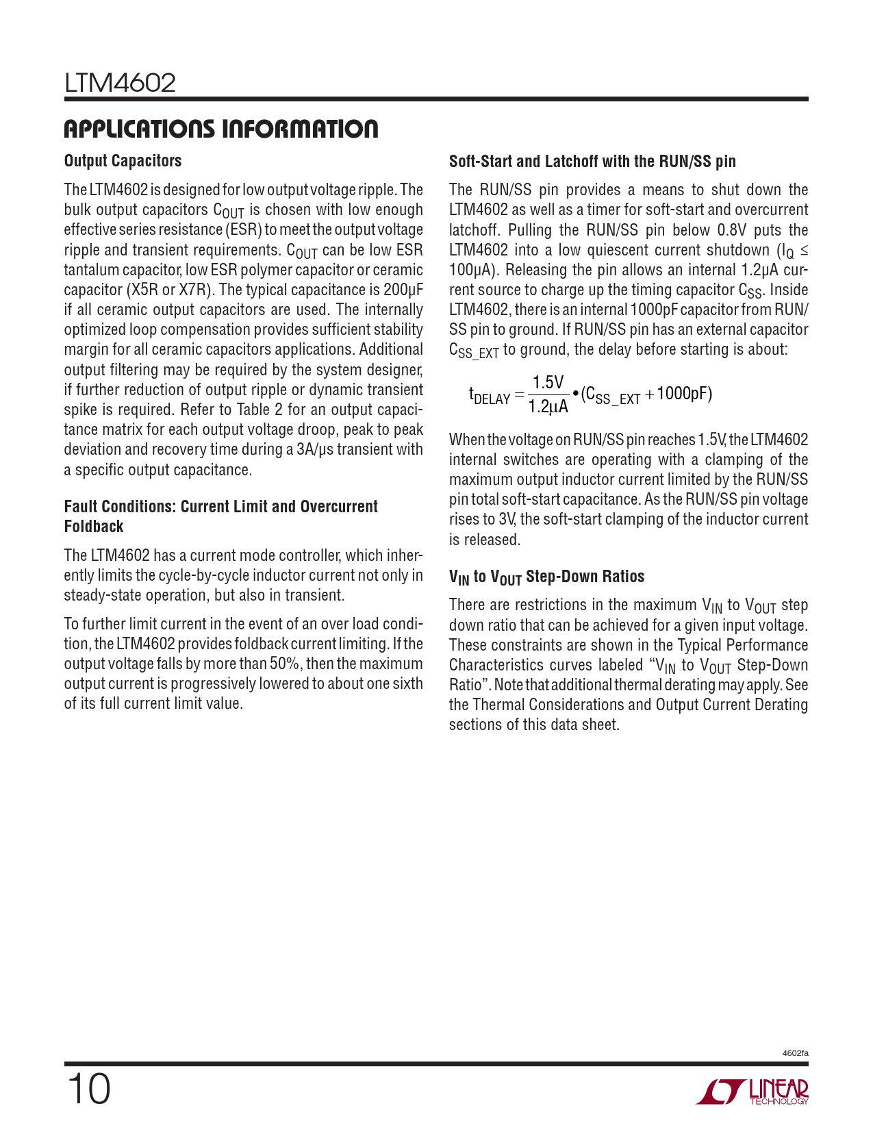 The LTM4602 is designed for low output voltage ripple. The The RUN/SS pin provides a means to shut down the bulk output capacitors COUT is chosen with low enough LTM4602 as well as a timer for soft-start and overcurrent effective series resistance (ESR) to meet the output voltage latchoff. Pulling the RUN/SS pin below 0.8V puts the ripple and transient requirements. COUT can be low ESR LTM4602 into a low quiescent current shutdown (IQ ≤ tantalum capacitor, low ESR polymer capacitor or ceramic 100μA). Releasing the pin allows an internal 1.2μA cur- capacitor (X5R or X7R). The typical capacitance is 200μF rent source to charge up the timing capacitor CSS. Inside if all ceramic output capacitors are used. The internally LTM4602, there is an internal 1000pF capacitor from RUN/ optimized loop compensation provides suffi cient stability SS pin to ground. If RUN/SS pin has an external capacitor margin for all ceramic capacitors applications. Additional CSS_EXT to ground, the delay before starting is about: output fi ltering may be required by the system designer, if further reduction of output ripple or dynamic transient tDELAY = 1.5V •(CSS_EXT +1000pF) spike is required. Refer to Table 2 for an output capaci- 1.2μA tance matrix for each output voltage droop, peak to peak When the voltage on RUN/SS pin reaches 1.5V, the LTM4602 deviation and recovery time during a 3A/μs transient with internal switches are operating with a clamping of the a specifi c output capacitance. maximum output inductor current limited by the RUN/SS
