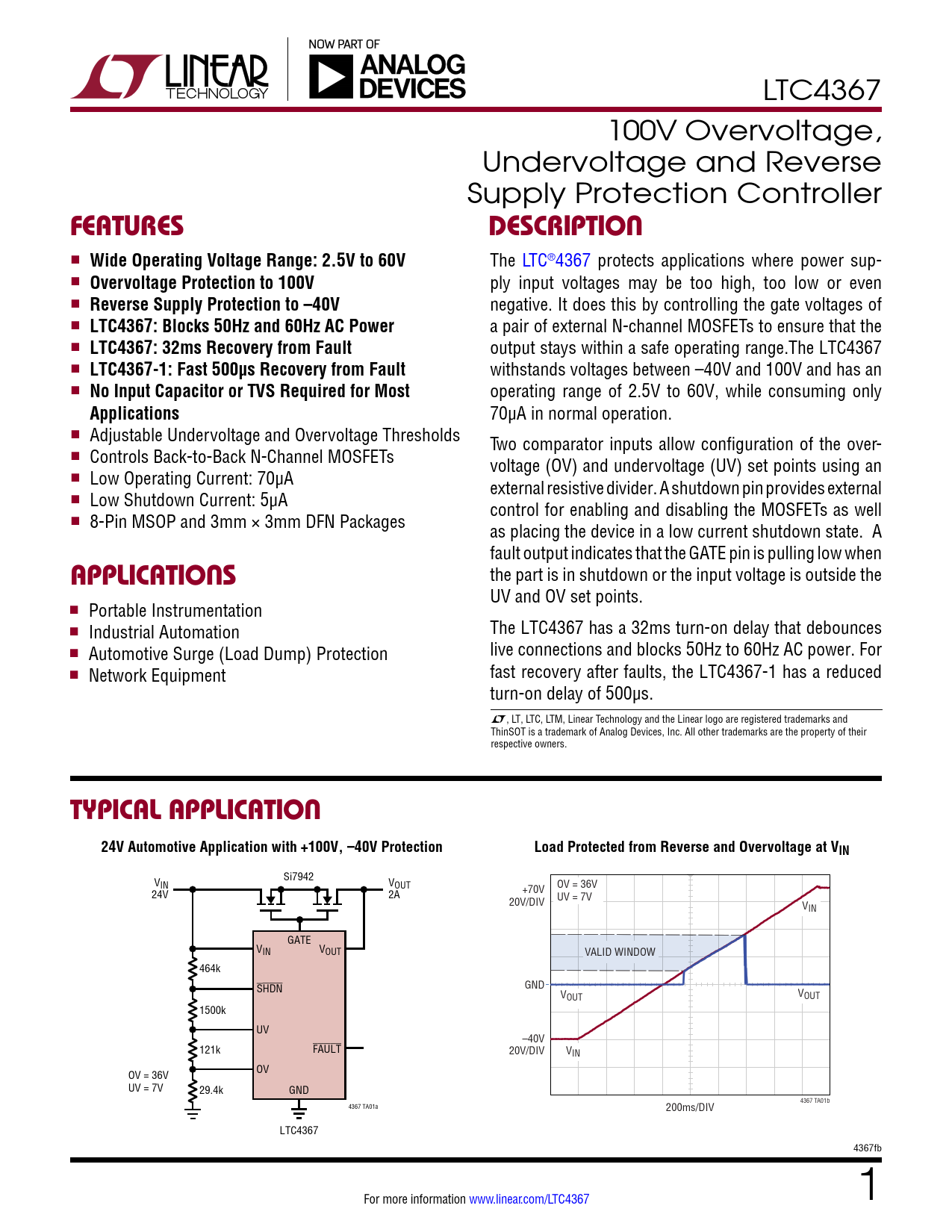 LTC4367 100V Overvoltage, Undervoltage and Reverse Supply Protection Controller FEATURESDESCRIPTION n Wide Operating Voltage Range: 2.5V to 60V The LTC®4367 protects applications where power sup- n Overvoltage Protection to 100V ply input voltages may be too high, too low or even n Reverse Supply Protection to –40V negative. It does this by controlling the gate voltages of n LTC4367: Blocks 50Hz and 60Hz AC Power a pair of external N-channel MOSFETs to ensure that the n LTC4367: 32ms Recovery from Fault output stays within a safe operating range.The LTC4367 n LTC4367-1: Fast 500µs Recovery from Fault withstands voltages between –40V and 100V and has an n No Input Capacitor or TVS Required for Most operating range of 2.5V to 60V, while consuming only Applications 70µA in normal operation. n Adjustable Undervoltage and Overvoltage Thresholds Two comparator inputs allow configuration of the over- n Controls Back-to-Back N-Channel MOSFETs voltage (OV) and undervoltage (UV) set points using an n Low Operating Current: 70µA external resistive divider. A shutdown pin provides external n Low Shutdown Current: 5µA control for enabling and disabling the MOSFETs as well n 8-Pin MSOP and 3mm × 3mm DFN Packages as placing the device in a low current shutdown state. A fault output indicates that the GATE pin is pulling low when APPLICATIONS the part is in shutdown or the input voltage is outside the UV and OV set points. n Portable Instrumentation n Industrial Automation The LTC4367 has a 32ms turn-on delay that debounces n Automotive Surge (Load Dump) Protection live connections and blocks 50Hz to 60Hz AC power. For n Network Equipment fast recovery after faults, the LTC4367-1 has a reduced turn-on delay of 500µs. L, LT, LTC, LTM, Linear Technology and the Linear logo are registered trademarks and ThinSOT is a trademark of Analog Devices, Inc. All other trademarks are the property of their respective owners. TYPICAL APPLICATION24V Automotive Application with +100V, –40V ProtectionLoad Protected from Reverse and Overvoltage at VIN V Si7942 IN VOUT OV = 36V +70V 24V 2A UV = 7V 20V/DIV VIN GATE VIN VOUT VALID WINDOW 464k GND SHDN V V OUT OUT 1500k UV –40V 121k FAULT 20V/DIV VIN OV OV = 36V UV = 7V 29.4k GND 4367 TA01a 200ms/DIV 4367 TA01b LTC4367 4367fb For more information www.linear.com/LTC4367 1