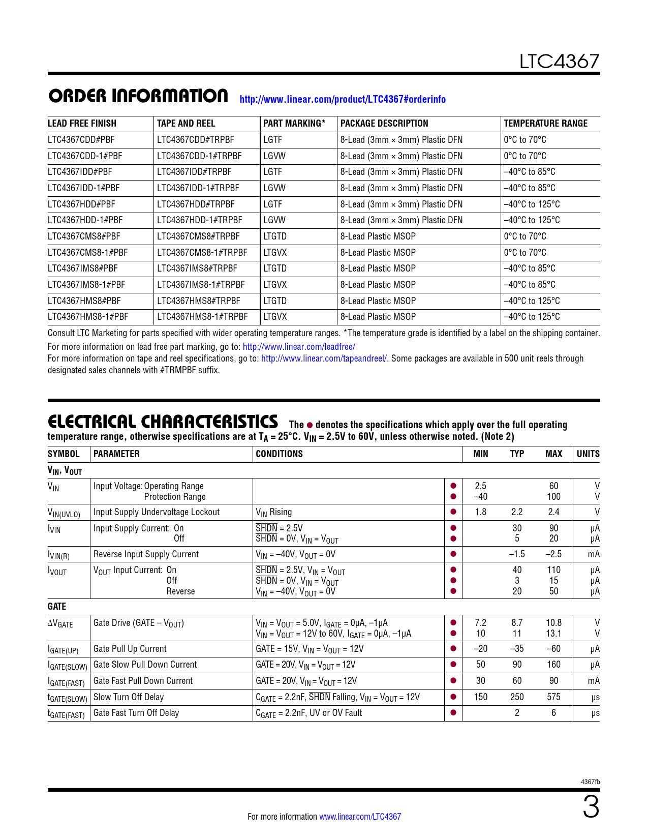 ORDER INFORMATION http://www.linear.com/product/LTC4367#orderinfo. LEAD FREE FINISH. TAPE AND REEL. PART MARKING*
