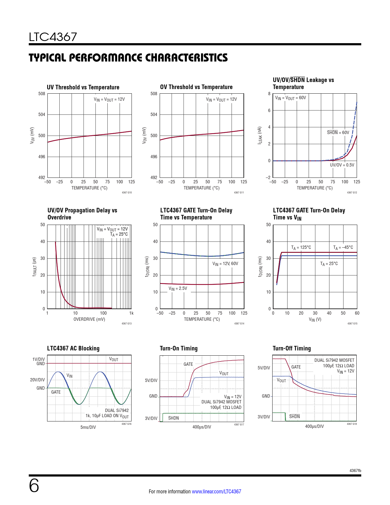 508 508 8 V V IN = VOUT = 12V VIN = VOUT = 12V IN = VOUT = 60V 6 504 504 4 SHDN = 60V (mV) 500 (mV) 500 (nA) V UV V OV I LEAK 2 496 496 0 UV/OV = 0.5V 492 492 –2 –50 –25 0 25 50 75 100 125 –50 –25 0 25 50 75 100 125 –50 –25 0 25 50 75 100 125 TEMPERATURE (°C) TEMPERATURE (°C) TEMPERATURE (°C) 4367 G10 4367 G11 4367 G12