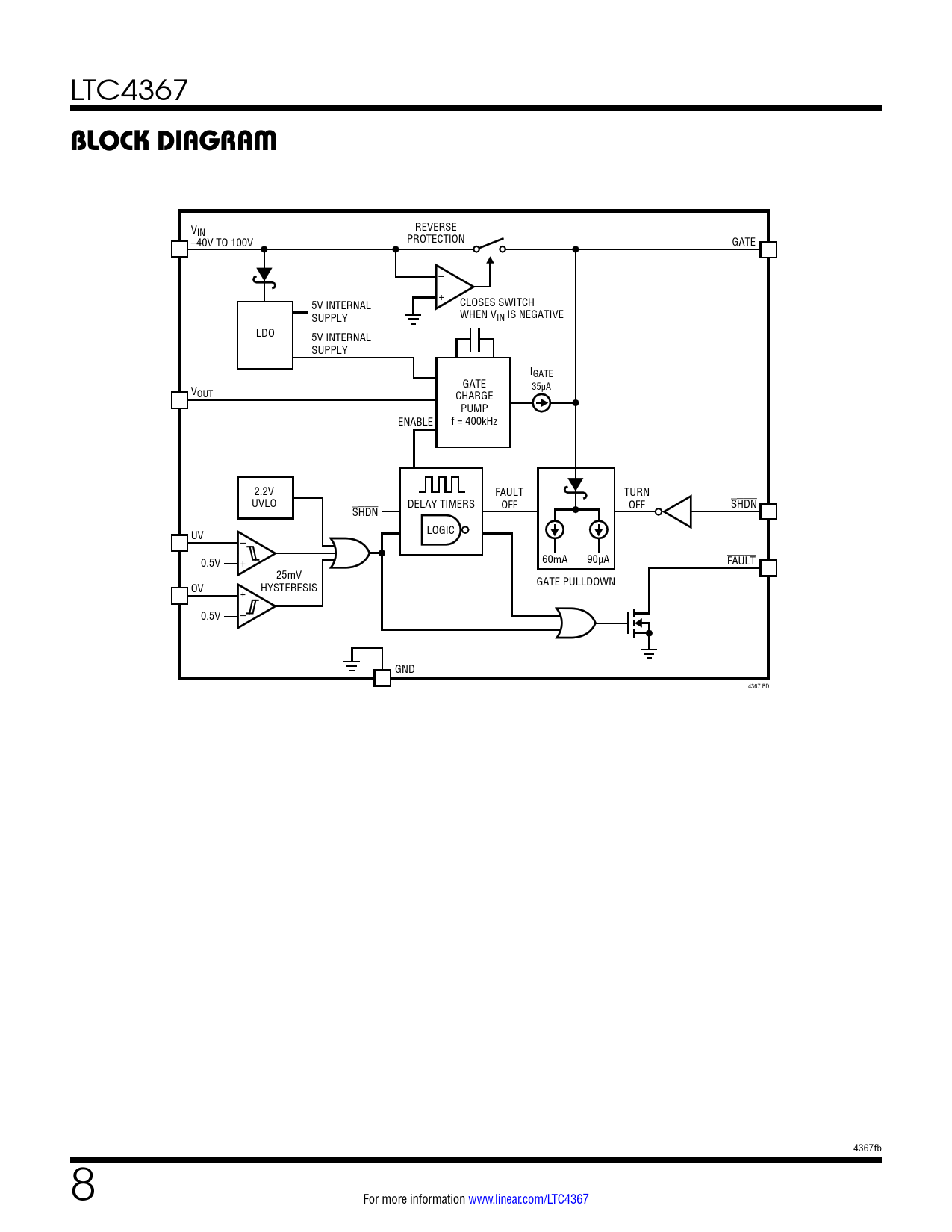 V REVERSE IN –40V TO 100V PROTECTION GATE – + 5V INTERNAL CLOSES SWITCH SUPPLY WHEN VIN IS NEGATIVE LDO 5V INTERNAL SUPPLY IGATE GATE 35µA VOUT CHARGE PUMP ENABLE f = 400kHz 2.2V FAULT TURN UVLO DELAY TIMERS OFF OFF SHDN SHDN UV LOGIC – 0.5V + 60mA 90µA FAULT 25mV OV HYSTERESIS GATE PULLDOWN + 0.5V – GND 4367 BD 4367fb 8 For more information www.linear.com/LTC4367