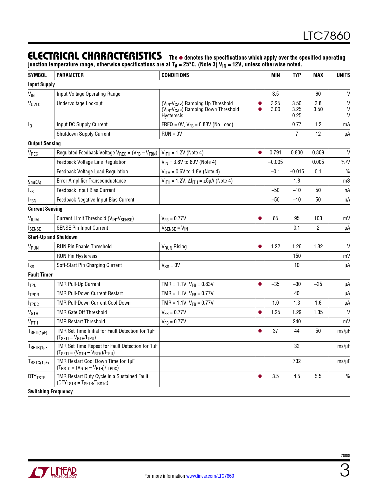 ITPU TMR Pull-Up Current TMR = 1.1V, VFB = 0.83V l –35 –30 –25 µA ITPDR TMR Pull-Down Current Restart TMR = 1.1V, VFB = 0.77V 40 µA ITPDC TMR Pull-Down Current Cool Down TMR = 1.1V, VFB = 0.77V 1.0 1.3 1.6 µA VGTH TMR Gate Off Threshold VFB = 0.77V l 1.25 1.29 1.35 V VRTH TMR Restart Threshold VFB = 0.77V 240 mV TSETI(1µF) TMR Set Time Initial for Fault Detection for 1µF l 37 44 50 ms/µF (TSETI = VGTH/ITPU) TSETR(1µF) TMR Set Time Repeat for Fault Detection for 1µF 32 ms/µF (TSETI = (VGTH – VRTH)/ITPU) TRSTC(1µF) TMR Restart Cool Down Time for 1µF 732 ms/µF (TRSTC = (VGTH – VRTH)/ITPDC) DTYTSTR TMR Restart Duty Cycle in a Sustained Fault l 3.5 4.5 5.5 % (DTYTSTR = TSETR/TRSTC)