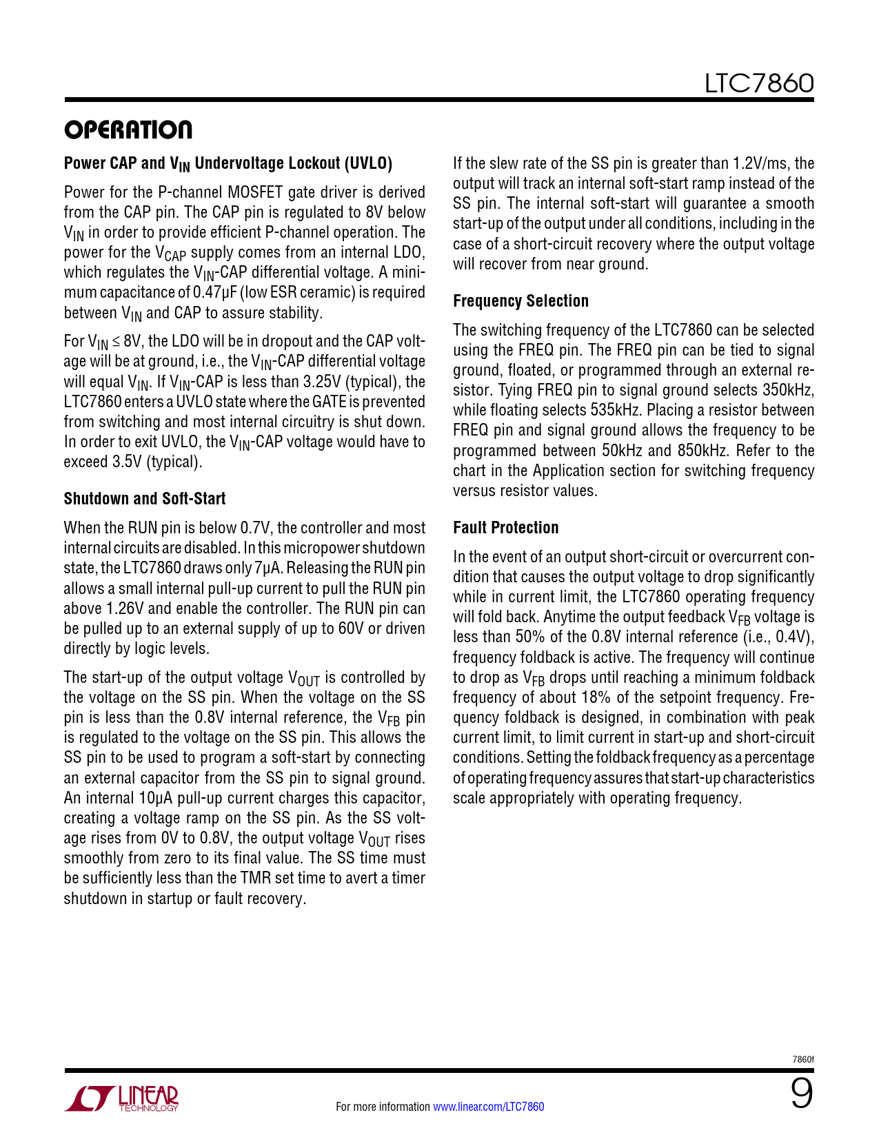 LTC7860 operaTion Power CAP and VIN Undervoltage Lockout (UVLO) If the slew rate of the SS pin is greater than 1.2V/ms, the Power for the P-channel MOSFET gate driver is derived output will track an internal soft-start ramp instead of the from the CAP pin. The CAP pin is regulated to 8V below SS pin. The internal soft-start will guarantee a smooth V start-up of the output under all conditions, including in the IN in order to provide efficient P-channel operation. The power for the V case of a short-circuit recovery where the output voltage CAP supply comes from an internal LDO, which regulates the V will recover from near ground. IN-CAP differential voltage. A mini- mum capacitance of 0.47µF (low ESR ceramic) is required Frequency Selection between VIN and CAP to assure stability. The switching frequency of the LTC7860 can be selected For VIN ≤ 8V, the LDO will be in dropout and the CAP volt- using the FREQ pin. The FREQ pin can be tied to signal age will be at ground, i.e., the VIN-CAP differential voltage ground, floated, or programmed through an external re- will equal VIN. If VIN-CAP is less than 3.25V (typical), the sistor. Tying FREQ pin to signal ground selects 350kHz, LTC7860 enters a UVLO state where the GATE is prevented while floating selects 535kHz. Placing a resistor between from switching and most internal circuitry is shut down. FREQ pin and signal ground allows the frequency to be In order to exit UVLO, the VIN-CAP voltage would have to programmed between 50kHz and 850kHz. Refer to the exceed 3.5V (typical). chart in the Application section for switching frequency Shutdown and Soft-Start versus resistor values. When the RUN pin is below 0.7V, the controller and most Fault Protection internal circuits are disabled. In this micropower shutdown In the event of an output short-circuit or overcurrent con- state, the LTC7860 draws only 7µA. Releasing the RUN pin dition that causes the output voltage to drop significantly allows a small internal pull-up current to pull the RUN pin while in current limit, the LTC7860 operating frequency above 1.26V and enable the controller. The RUN pin can will fold back. Anytime the output feedback V be pulled up to an external supply of up to 60V or driven FB voltage is less than 50% of the 0.8V internal reference (i.e., 0.4V), directly by logic levels. frequency foldback is active. The frequency will continue The start-up of the output voltage VOUT is controlled by to drop as VFB drops until reaching a minimum foldback the voltage on the SS pin. When the voltage on the SS frequency of about 18% of the setpoint frequency. Fre- pin is less than the 0.8V internal reference, the VFB pin quency foldback is designed, in combination with peak is regulated to the voltage on the SS pin. This allows the current limit, to limit current in start-up and short-circuit SS pin to be used to program a soft-start by connecting conditions. Setting the foldback frequency as a percentage an external capacitor from the SS pin to signal ground. of operating frequency assures that start-up characteristics An internal 10µA pull-up current charges this capacitor, scale appropriately with operating frequency. creating a voltage ramp on the SS pin. As the SS volt- age rises from 0V to 0.8V, the output voltage VOUT rises smoothly from zero to its final value. The SS time must be sufficiently less than the TMR set time to avert a timer shutdown in startup or fault recovery. 7860f For more information www.linear.com/LTC7860 9