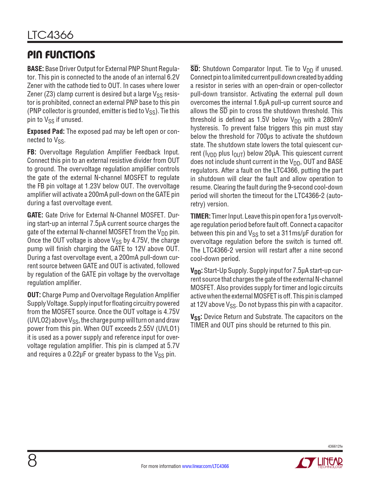 Device Return and Substrate. The capacitors on the SS, the charge pump will turn on and draw power from this pin. When OUT exceeds 2.55V (UVLO1) TIMER and OUT pins should be returned to this pin. it is used as a power supply and reference input for over- voltage regulation amplifier. This pin is clamped at 5.7V and requires a 0.22µF or greater bypass to the VSS pin. 436612fe 8 For more information www.linear.com/LTC4366 Document Outline Features Applications Description Typical Application Absolute Maximum Ratings Pin Configuration Order Information Electrical Characteristics Pin Functions Simplified Diagram Functional Diagram Operation Applications Information Package Description Typical Application Related Parts