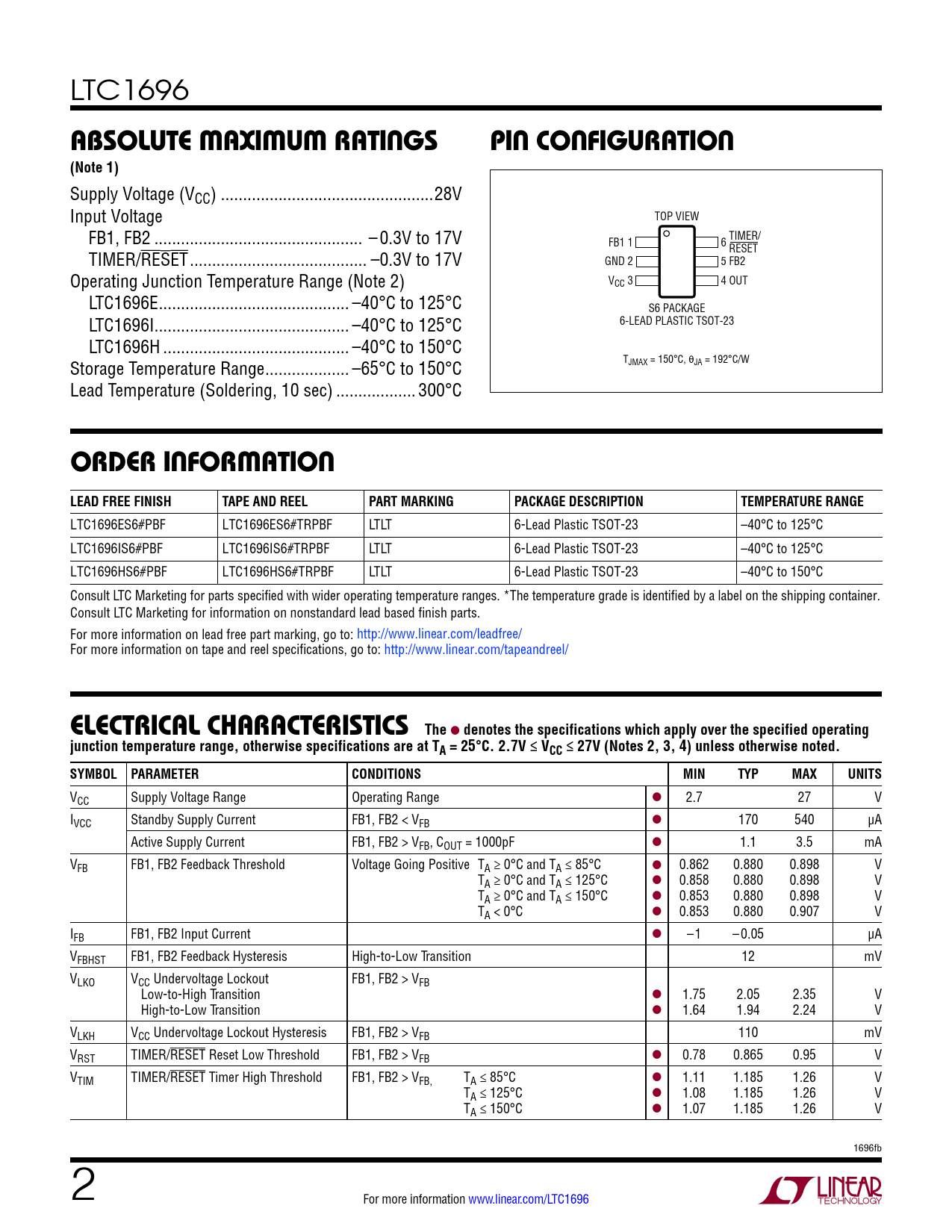 VCC Supply Voltage Range Operating Range ● 2.7 27 V IVCC Standby Supply Current FB1, FB2 < VFB ● 170 540 µA Active Supply Current FB1, FB2 > VFB, COUT = 1000pF ● 1.1 3.5 mA VFB FB1, FB2 Feedback Threshold Voltage Going Positive TA ≥ 0°C and TA ≤ 85°C ● 0.862 0.880 0.898 V TA ≥ 0°C and TA ≤ 125°C ● 0.858 0.880 0.898 V TA ≥ 0°C and TA ≤ 150°C ● 0.853 0.880 0.898 V TA < 0°C ● 0.853 0.880 0.907 V IFB FB1, FB2 Input Current ● –1 –0.05 µA VFBHST FB1, FB2 Feedback Hysteresis High-to-Low Transition 12 mV VLKO VCC Undervoltage Lockout FB1, FB2 > VFB Low-to-High Transition ● 1.75 2.05 2.35 V High-to-Low Transition ● 1.64 1.94 2.24 V VLKH VCC Undervoltage Lockout Hysteresis FB1, FB2 > VFB 110 mV VRST TIMER/RESET Reset Low Threshold FB1, FB2 > VFB ● 0.78 0.865 0.95 V VTIM TIMER/RESET Timer High Threshold FB1, FB2 > VFB, TA ≤ 85°C ● 1.11 1.185 1.26 V TA ≤ 125°C ● 1.08 1.185 1.26 V TA ≤ 150°C ● 1.07 1.185 1.26 V 1696fb 2 For more information www.linear.com/LTC1696