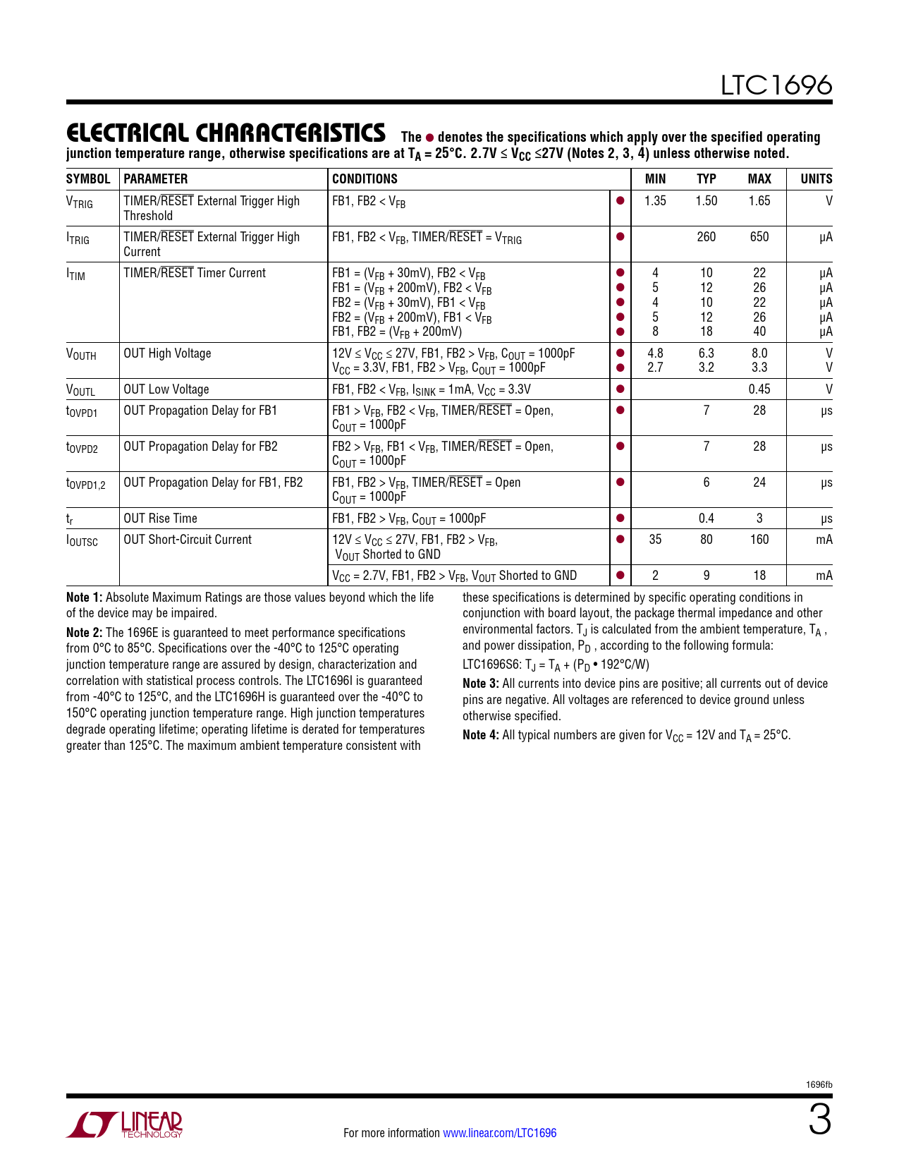 All typical numbers are given for V greater than 125°C. The maximum ambient temperature consistent with CC = 12V and TA = 25°C. 1696fb For more information www.linear.com/LTC1696 3