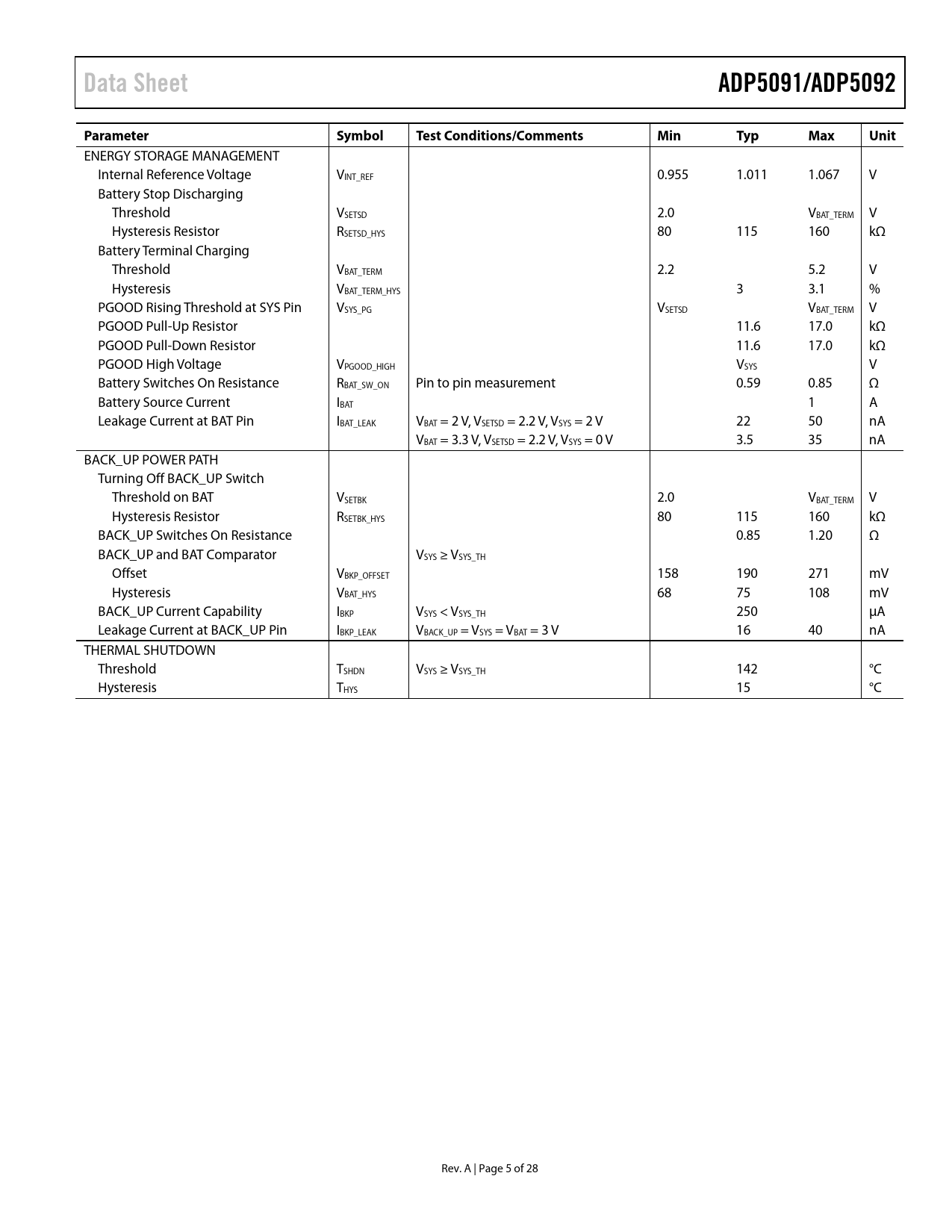 | Páginas / Página | 28 / 5 — Data Sheet. ADP5091/ADP5092. Parameter. Symbol. Test Conditions/Comments. … |