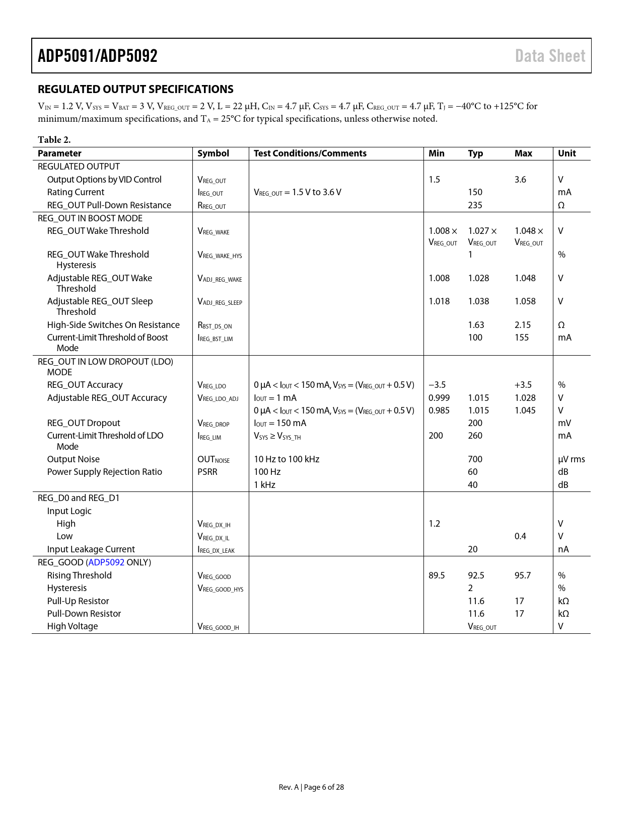 ADP5091/ADP5092. Data Sheet. REGULATED OUTPUT SPECIFICATIONS. Table 2. Parameter. Symbol. Test Conditions/Comments. Min. Typ. Max. Unit