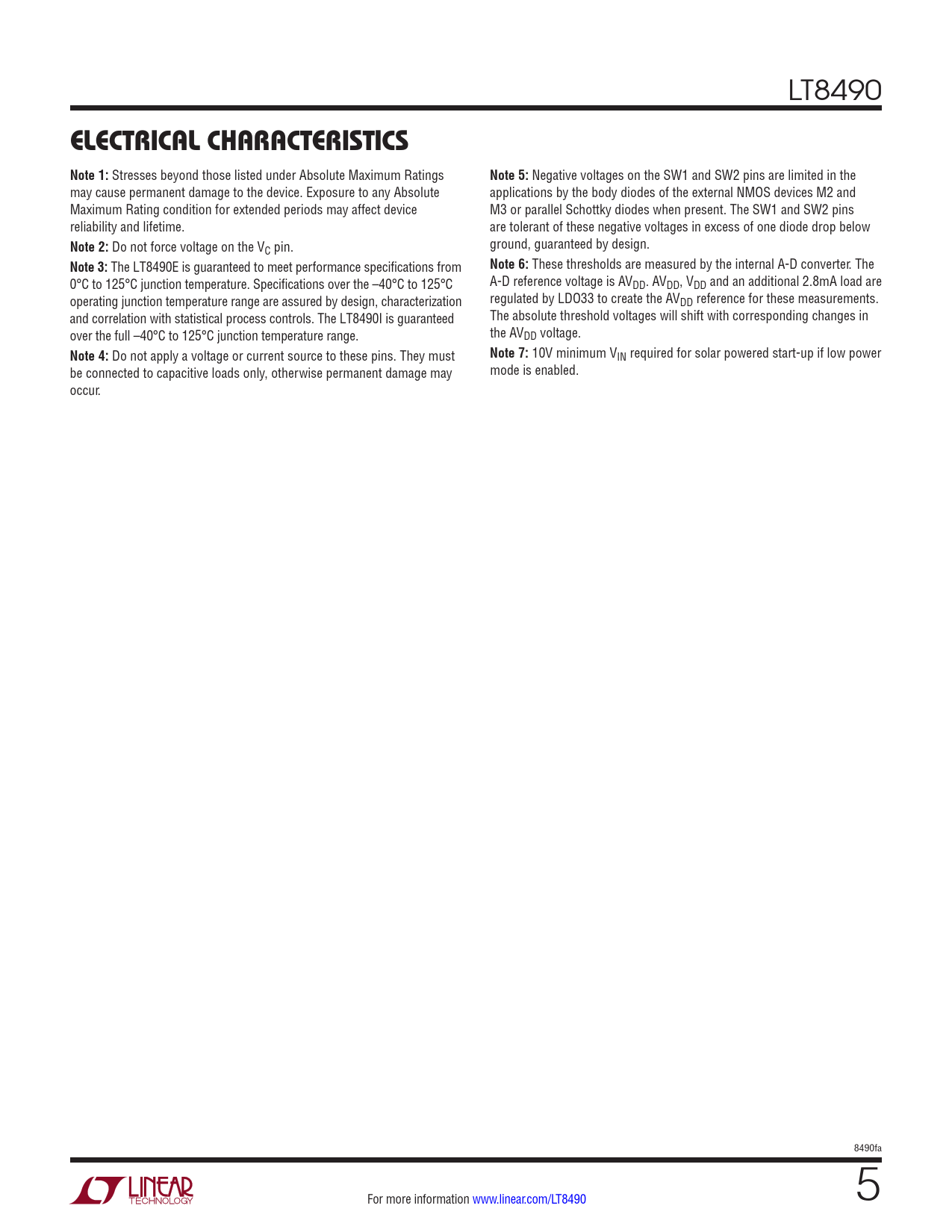 LT8490 elecTrical characTerisTics Note 1: Stresses beyond those listed under Absolute Maximum Ratings Note 5: Negative voltages on the SW1 and SW2 pins are limited in the may cause permanent damage to the device. Exposure to any Absolute applications by the body diodes of the external NMOS devices M2 and Maximum Rating condition for extended periods may affect device M3 or parallel Schottky diodes when present. The SW1 and SW2 pins reliability and lifetime. are tolerant of these negative voltages in excess of one diode drop below Note 2: Do not force voltage on the V ground, guaranteed by design. C pin. Note 3: The LT8490E is guaranteed to meet performance specifications from Note 6: These thresholds are measured by the internal A-D converter. The 0°C to 125°C junction temperature. Specifications over the –40°C to 125°C A-D reference voltage is AVDD. AVDD, VDD and an additional 2.8mA load are operating junction temperature range are assured by design, characterization regulated by LDO33 to create the AVDD reference for these measurements. and correlation with statistical process controls. The LT8490I is guaranteed The absolute threshold voltages will shift with corresponding changes in over the full –40°C to 125°C junction temperature range. the AVDD voltage. Note 4: Do not apply a voltage or current source to these pins. They must Note 7: 10V minimum VIN required for solar powered start-up if low power be connected to capacitive loads only, otherwise permanent damage may mode is enabled. occur. 8490fa For more information www.linear.com/LT8490 5 Document Outline Features Applications Typical Application Description Absolute Maximum Ratings Order Information Pin Configuration Electrical Characteristics Typical Performance Characteristics Pin Functions Block Diagram Operation Applications Information Package Description Revision History Typical Application Related Parts