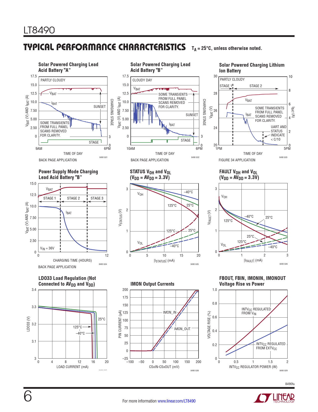 15.0 VBAT 3 3 –40°C V 12.5 OH VOH STAGE 1 STAGE 2 STAGE 3 (A) 10.0 125°C 25°C BAT 2 2 IBAT (V) (V) T –40°C 7.50 25°C ATUS 125°C V FAUL (V) AND I V ST 5.00 1 125°C 25°C 1 V BAT 25°C 2.50 V 125°C OL VOL –40°C –40°C VIN = 36V 0 0 0 0 12 0 5 10 15 20 0 1 2 3 CHARGING TIME (HOURS) |I |I STATUS| (mA) FAULT| (mA) 8490 G04 8490 G05 8490 G06 BACK PAGE APPLICATION