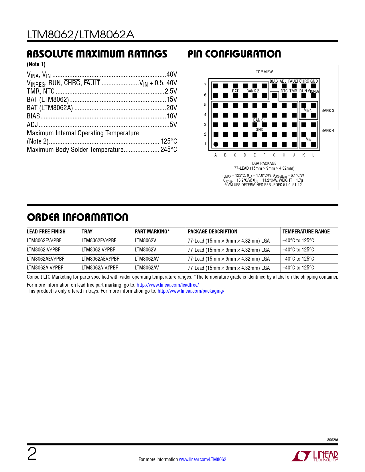 V TOP VIEW INA, VIN ...40V VINREG, RUN, CHRG, FAULT ..VIN + 0.5, 40V BIAS ADJ FAULT CHRG GND 7 TMR, NTC ..2.5V BAT BANK 2 NTC TMR RUN VINREG BAT (LTM8062) ...15V 6 BAT (LTM8062A) ..20V 5 VINA BANK 3 BIAS ..10V 4 ADJ ...5V BANK 1 3 Maximum Internal Operating Temperature GND BANK 4 2 (Note 2) ... 125°C VIN 1 Maximum Body Solder Temperature ... 245°C A B C D E F G H J K L LGA PACKAGE 77-LEAD (15mm × 9mm × 4.32mm) TJMAX = 125°C, θJA = 17.0°C/W, θJCbottom = 6.1°C/W, θJCtop = 16.2°C/W, θJB = 11.2°C/W, WEIGHT = 1.7g θ VALUES DETERMINED PER JEDEC 51-9, 51-12