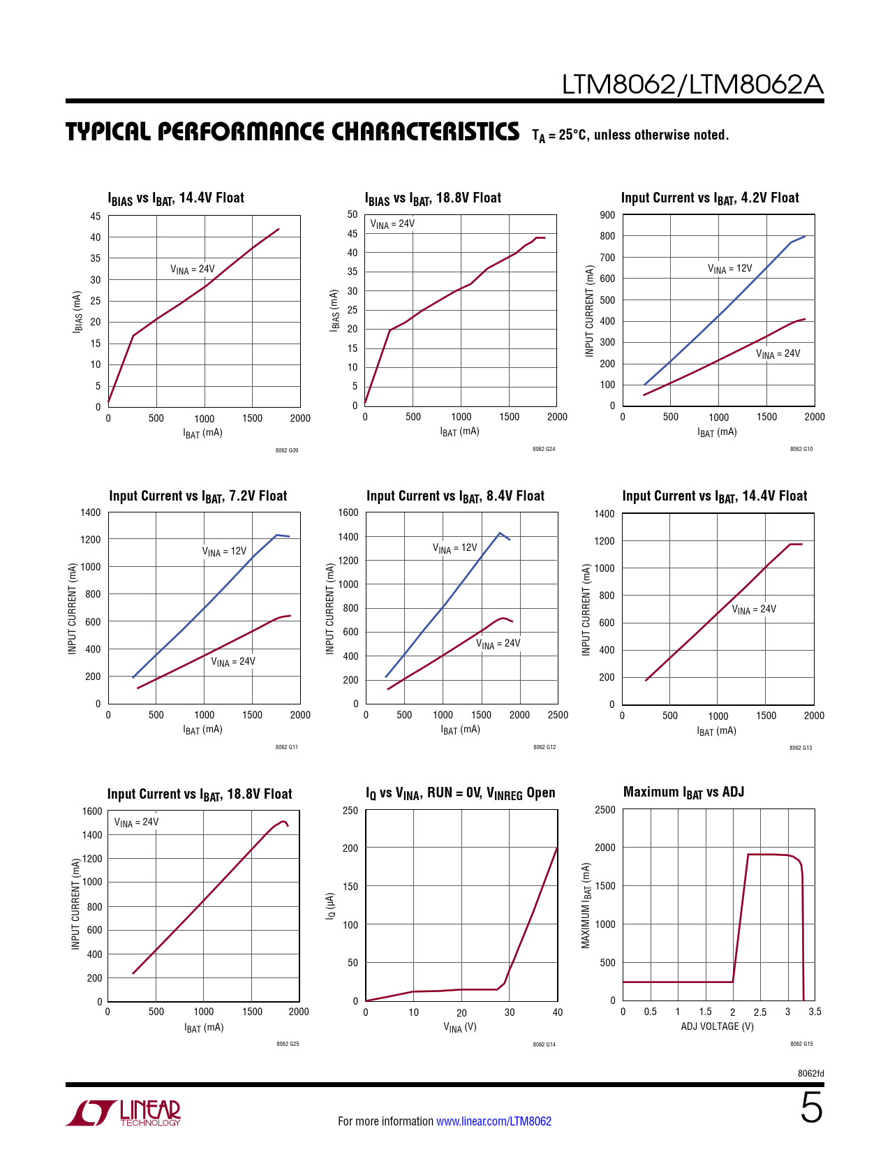 1400 1600 1400 1200 1400 1200 V V INA = 12V INA = 12V 1200 1000 1000 1000 800 800 800 VINA = 24V 600 600 600 V INPUT CURRENT (mA) 400 INPUT CURRENT (mA) INA = 24V INPUT CURRENT (mA) 400 V 400 INA = 24V 200 200 200 0 0 0 0 500 1000 1500 2000 0 500 1000 1500 2000 2500 0 500 1000 1500 2000 IBAT (mA) IBAT (mA) IBAT (mA) 8062 G11 8062 G12 8062 G13