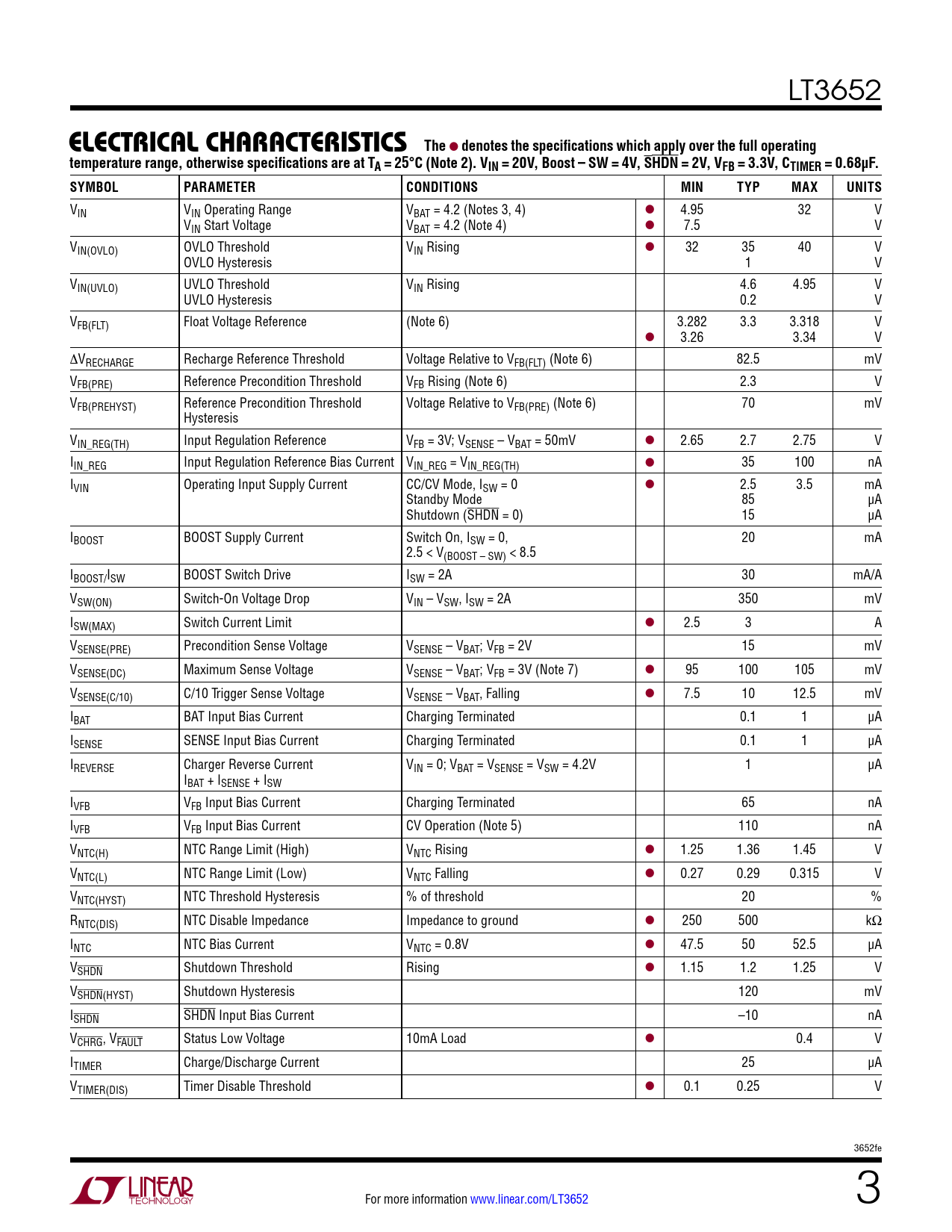 VIN VIN Operating Range VBAT = 4.2 (Notes 3, 4) l 4.95 32 V VIN Start Voltage VBAT = 4.2 (Note 4) l 7.5 V VIN(OVLO) OVLO Threshold VIN Rising l 32 35 40 V OVLO Hysteresis 1 V VIN(UVLO) UVLO Threshold VIN Rising 4.6 4.95 V UVLO Hysteresis 0.2 V VFB(FLT) Float Voltage Reference (Note 6) 3.282 3.3 3.318 V l 3.26 3.34 V ΔVRECHARGE Recharge Reference Threshold Voltage Relative to VFB(FLT) (Note 6) 82.5 mV VFB(PRE) Reference Precondition Threshold VFB Rising (Note 6) 2.3 V VFB(PREHYST) Reference Precondition Threshold Voltage Relative to VFB(PRE) (Note 6) 70 mV Hysteresis VIN_REG(TH) Input Regulation Reference VFB = 3V; VSENSE – VBAT = 50mV l 2.65 2.7 2.75 V IIN_REG Input Regulation Reference Bias Current VIN_REG = VIN_REG(TH) l 35 100 nA IVIN Operating Input Supply Current CC/CV Mode, ISW = 0 l 2.5 3.5 mA Standby Mode 85 µA Shutdown (SHDN = 0) 15 µA IBOOST BOOST Supply Current Switch On, ISW = 0, 20 mA 2.5 < V(BOOST – SW) < 8.5 IBOOST/ISW BOOST Switch Drive ISW = 2A 30 mA/A VSW(ON) Switch-On Voltage Drop VIN – VSW, ISW = 2A 350 mV ISW(MAX) Switch Current Limit l 2.5 3 A VSENSE(PRE) Precondition Sense Voltage VSENSE – VBAT; VFB = 2V 15 mV VSENSE(DC) Maximum Sense Voltage VSENSE – VBAT; VFB = 3V (Note 7) l 95 100 105 mV VSENSE(C/10) C/10 Trigger Sense Voltage VSENSE – VBAT, Falling l 7.5 10 12.5 mV IBAT BAT Input Bias Current Charging Terminated 0.1 1 µA ISENSE SENSE Input Bias Current Charging Terminated 0.1 1 µA IREVERSE Charger Reverse Current VIN = 0; VBAT = VSENSE = VSW = 4.2V 1 µA IBAT + ISENSE + ISW IVFB VFB Input Bias Current Charging Terminated 65 nA IVFB VFB Input Bias Current CV Operation (Note 5) 110 nA VNTC(H) NTC Range Limit (High) VNTC Rising l 1.25 1.36 1.45 V VNTC(L) NTC Range Limit (Low) VNTC Falling l 0.27 0.29 0.315 V VNTC(HYST) NTC Threshold Hysteresis % of threshold 20 % RNTC(DIS) NTC Disable Impedance Impedance to ground l 250 500 kΩ INTC NTC Bias Current VNTC = 0.8V l 47.5 50 52.5 µA VSHDN Shutdown Threshold Rising l 1.15 1.2 1.25 V VSHDN(HYST) Shutdown Hysteresis 120 mV ISHDN SHDN Input Bias Current –10 nA VCHRG, VFAULT Status Low Voltage 10mA Load l 0.4 V ITIMER Charge/Discharge Current 25 µA VTIMER(DIS) Timer Disable Threshold l 0.1 0.25 V 3652fe For more information www.linear.com/LT3652 3 Document Outline Description Typical Application Absolute Maximum Ratings Pin Configuration Electrical Characteristics Typical Performance Characteristics Pin Functions Block Diagram Applications Information Package Description Typical Application Related Parts