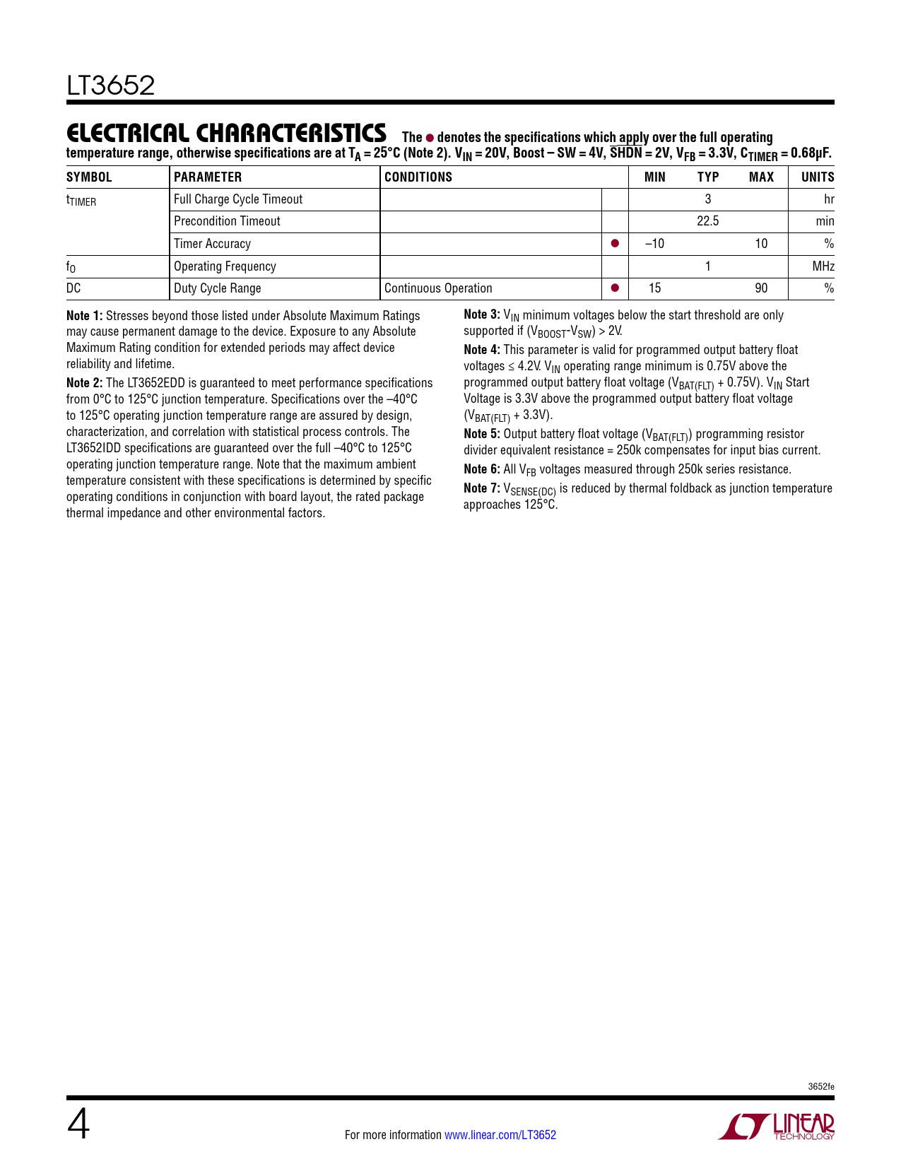 Output battery float voltage (VBAT(FLT)) programming resistor LT3652IDD specifications are guaranteed over the full –40°C to 125°C divider equivalent resistance = 250k compensates for input bias current. operating junction temperature range. Note that the maximum ambient