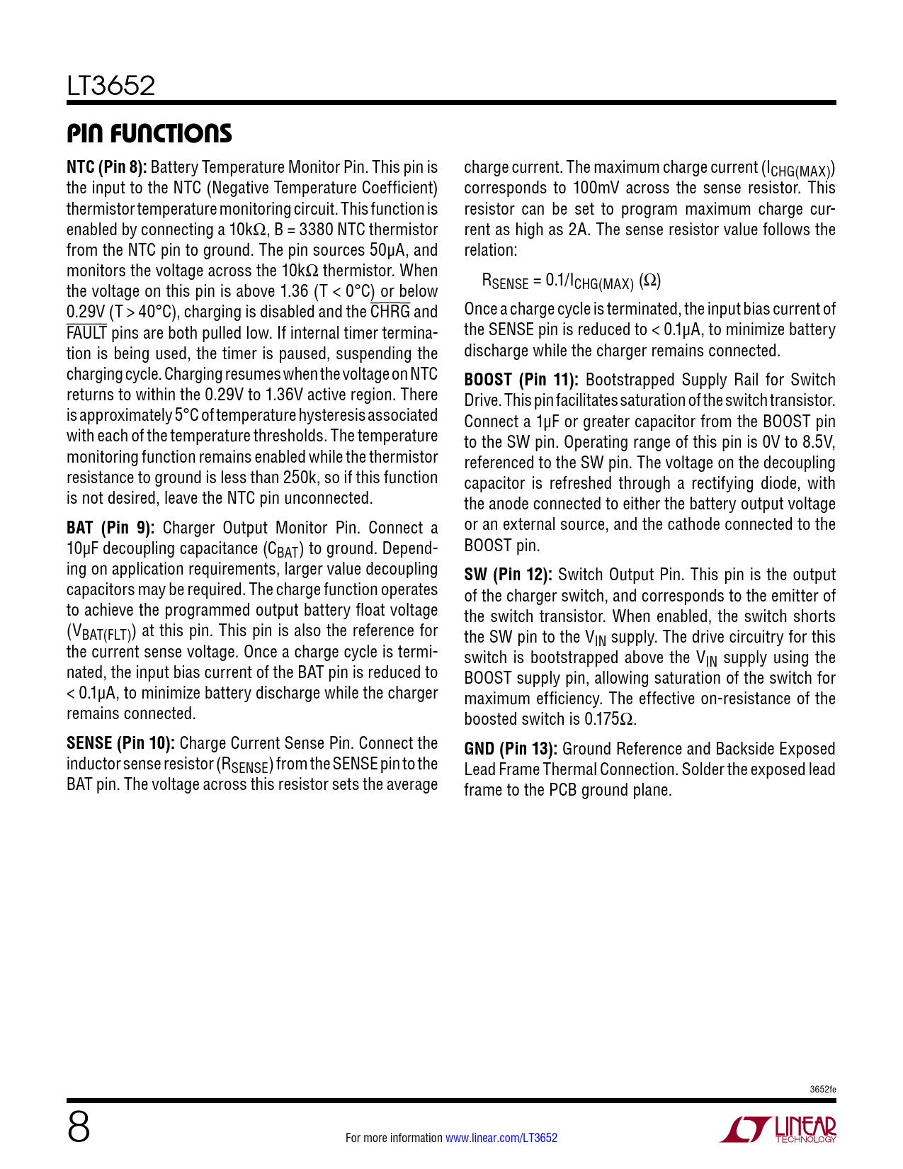 LT3652 PIN FUNCTIONS NTC (Pin 8): Battery Temperature Monitor Pin. This pin is charge current. The maximum charge current (ICHG(MAX)) the input to the NTC (Negative Temperature Coefficient) corresponds to 100mV across the sense resistor. This thermistor temperature monitoring circuit. This function is resistor can be set to program maximum charge cur- enabled by connecting a 10kΩ, B = 3380 NTC thermistor rent as high as 2A. The sense resistor value fol ows the from the NTC pin to ground. The pin sources 50µA, and relation: monitors the voltage across the 10kΩ thermistor. When R the voltage on this pin is above 1.36 (T < 0°C) or below SENSE = 0.1/ICHG(MAX) (Ω) 0.29V (T > 40°C), charging is disabled and the CHRG and Once a charge cycle is terminated, the input bias current of FAULT pins are both pulled low. If internal timer termina- the SENSE pin is reduced to < 0.1µA, to minimize battery tion is being used, the timer is paused, suspending the discharge while the charger remains connected. charging cycle. Charging resumes when the voltage on NTC BOOST (Pin 11): Bootstrapped Supply Rail for Switch returns to within the 0.29V to 1.36V active region. There Drive. This pin facilitates saturation of the switch transistor. is approximately 5°C of temperature hysteresis associated Connect a 1µF or greater capacitor from the BOOST pin with each of the temperature thresholds. The temperature to the SW pin. Operating range of this pin is 0V to 8.5V, monitoring function remains enabled while the thermistor referenced to the SW pin. The voltage on the decoupling resistance to ground is less than 250k, so if this function capacitor is refreshed through a rectifying diode, with is not desired, leave the NTC pin unconnected. the anode connected to either the battery output voltage BAT (Pin 9): Charger Output Monitor Pin. Connect a or an external source, and the cathode connected to the 10µF decoupling capacitance (CBAT) to ground. Depend- BOOST pin. ing on application requirements, larger value decoupling SW (Pin 12): Switch Output Pin. This pin is the output capacitors may be required. The charge function operates of the charger switch, and corresponds to the emitter of to achieve the programmed output battery float voltage the switch transistor. When enabled, the switch shorts (VBAT(FLT)) at this pin. This pin is also the reference for the SW pin to the V the current sense voltage. Once a charge cycle is termi- IN supply. The drive circuitry for this switch is bootstrapped above the V nated, the input bias current of the BAT pin is reduced to IN supply using the BOOST supply pin, al owing saturation of the switch for < 0.1µA, to minimize battery discharge while the charger maximum efficiency. The effective on-resistance of the remains connected. boosted switch is 0.175Ω. SENSE (Pin 10): Charge Current Sense Pin. Connect the GND (Pin 13): Ground Reference and Backside Exposed inductor sense resistor (RSENSE) from the SENSE pin to the Lead Frame Thermal Connection. Solder the exposed lead BAT pin. The voltage across this resistor sets the average frame to the PCB ground plane. 3652fe 8 For more information www.linear.com/LT3652 Document Outline Description Typical Application Absolute Maximum Ratings Pin Configuration Electrical Characteristics Typical Performance Characteristics Pin Functions Block Diagram Applications Information Package Description Typical Application Related Parts