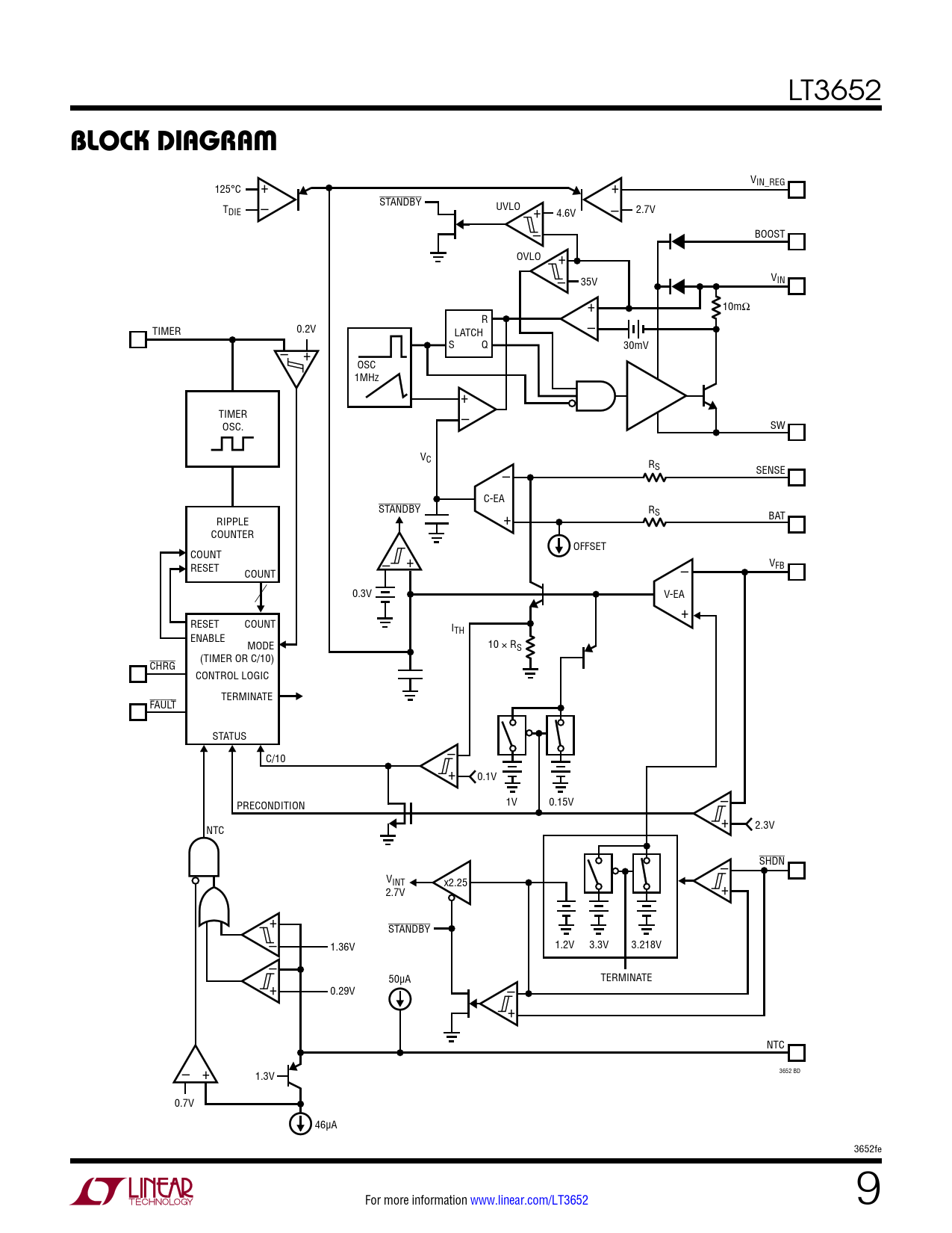 + 125°C + VIN_REG STANDBY – T + DIE – UVLO 4.6V 2.7V – BOOST OVLO + – 35V VIN + 10mΩ R TIMER 0.2V LATCH – – + S Q 30mV OSC 1MHz + TIMER – OSC. SW VC RS SENSE – C-EA STANDBY RS BAT RIPPLE + COUNTER OFFSET COUNT – + RESET COUNT – VFB 0.3V V-EA + RESET COUNT ITH ENABLE MODE 10 × RS (TIMER OR C/10) CHRG CONTROL LOGIC TERMINATE FAULT STATUS – C/10 + 0.1V – PRECONDITION 1V 0.15V + 2.3V NTC – SHDN VINT x2.25 + 2.7V + – STANDBY 1.36V 1.2V 3.3V 3.218V – + 50µA – TERMINATE 0.29V + NTC 3652 BD – + 1.3V 0.7V 46µA 3652fe For more information www.linear.com/LT3652 9 Document Outline Description Typical Application Absolute Maximum Ratings Pin Configuration Electrical Characteristics Typical Performance Characteristics Pin Functions Block Diagram Applications Information Package Description Typical Application Related Parts