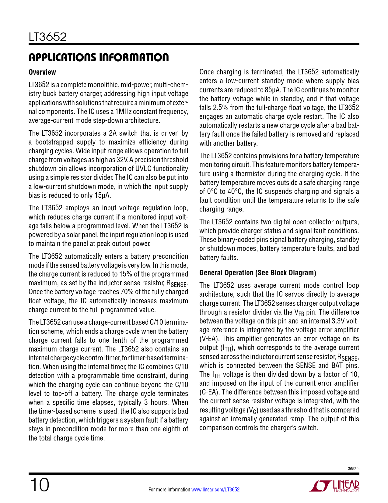 LT3652 APPLICATIONS INFORMATION Overview Once charging is terminated, the LT3652 automatically LT3652 is a complete monolithic, mid-power, multi-chem- enters a low-current standby mode where supply bias istry buck battery charger, addressing high input voltage currents are reduced to 85µA. The IC continues to monitor applications with solutions that require a minimum of exter- the battery voltage while in standby, and if that voltage nal components. The IC uses a 1MHz constant frequency, falls 2.5% from the full-charge float voltage, the LT3652 average-current mode step-down architecture. engages an automatic charge cycle restart. The IC also automatically restarts a new charge cycle after a bad bat- The LT3652 incorporates a 2A switch that is driven by tery fault once the failed battery is removed and replaced a bootstrapped supply to maximize efficiency during with another battery. charging cycles. Wide input range allows operation to full charge from voltages as high as 32V. A precision threshold The LT3652 contains provisions for a battery temperature shutdown pin allows incorporation of UVLO functionality monitoring circuit. This feature monitors battery tempera- using a simple resistor divider. The IC can also be put into ture using a thermistor during the charging cycle. If the a low-current shutdown mode, in which the input supply battery temperature moves outside a safe charging range bias is reduced to only 15µA. of 0°C to 40°C, the IC suspends charging and signals a fault condition until the temperature returns to the safe The LT3652 employs an input voltage regulation loop, charging range. which reduces charge current if a monitored input volt- age falls below a programmed level. When the LT3652 is The LT3652 contains two digital open-collector outputs, powered by a solar panel, the input regulation loop is used which provide charger status and signal fault conditions. to maintain the panel at peak output power. These binary-coded pins signal battery charging, standby or shutdown modes, battery temperature faults, and bad The LT3652 automatically enters a battery precondition battery faults. mode if the sensed battery voltage is very low. In this mode, the charge current is reduced to 15% of the programmed General Operation (See Block Diagram) maximum, as set by the inductor sense resistor, RSENSE. The LT3652 uses average current mode control loop Once the battery voltage reaches 70% of the fully charged architecture, such that the IC servos directly to average float voltage, the IC automatically increases maximum charge current. The LT3652 senses charger output voltage charge current to the full programmed value. through a resistor divider via the VFB pin. The difference The LT3652 can use a charge-current based C/10 termina- between the voltage on this pin and an internal 3.3V volt- tion scheme, which ends a charge cycle when the battery age reference is integrated by the voltage error amplifier charge current falls to one tenth of the programmed (V-EA). This amplifier generates an error voltage on its maximum charge current. The LT3652 also contains an output (ITH), which corresponds to the average current internal charge cycle control timer, for timer-based termina- sensed across the inductor current sense resistor, RSENSE, tion. When using the internal timer, the IC combines C/10 which is connected between the SENSE and BAT pins. detection with a programmable time constraint, during The ITH voltage is then divided down by a factor of 10, which the charging cycle can continue beyond the C/10 and imposed on the input of the current error amplifier level to top-off a battery. The charge cycle terminates (C-EA). The difference between this imposed voltage and when a specific time elapses, typically 3 hours. When the current sense resistor voltage is integrated, with the the timer-based scheme is used, the IC also supports bad resulting voltage (VC) used as a threshold that is compared battery detection, which triggers a system fault if a battery against an internally generated ramp. The output of this stays in precondition mode for more than one eighth of comparison controls the charger’s switch. the total charge cycle time. 3652fe 10 For more information www.linear.com/LT3652 Document Outline Description Typical Application Absolute Maximum Ratings Pin Configuration Electrical Characteristics Typical Performance Characteristics Pin Functions Block Diagram Applications Information Package Description Typical Application Related Parts