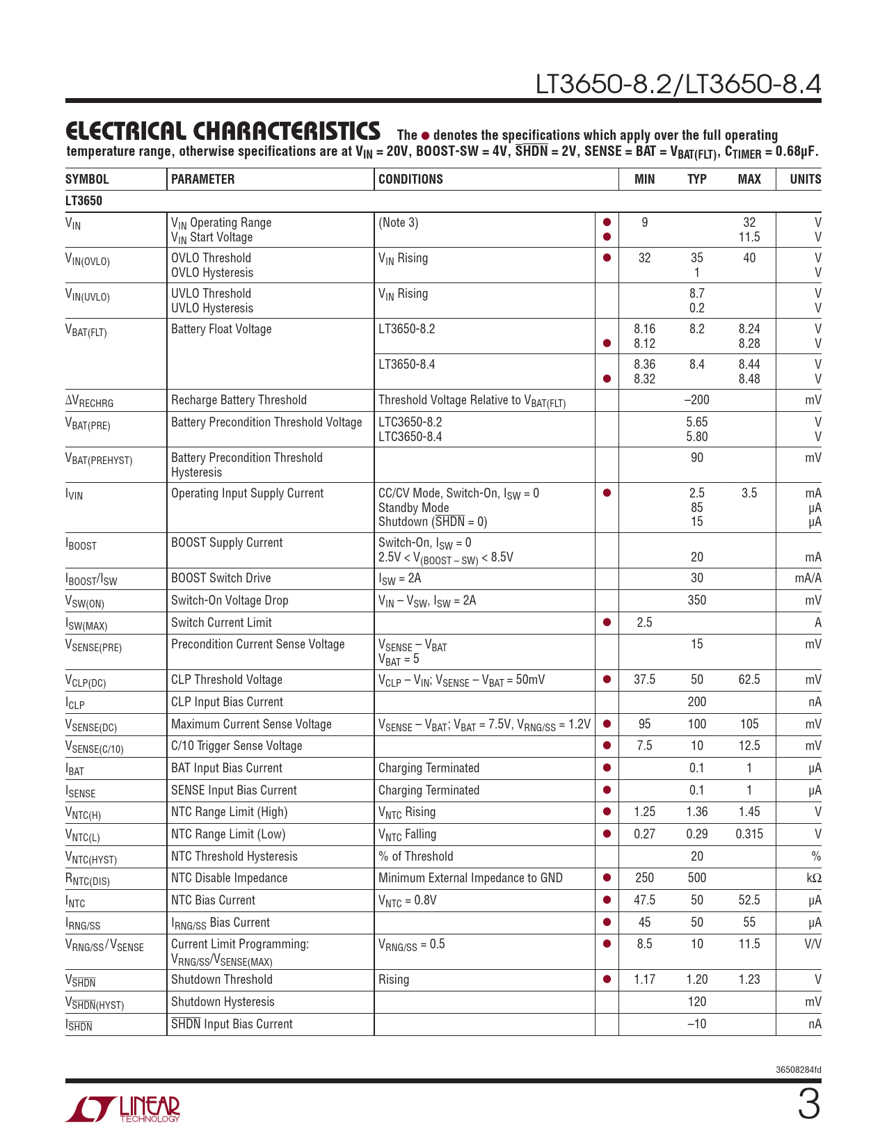 LT3650-8.2/LT3650-8.4 e lecTrical characTerisTics The l denotes the specifications which apply over the full operatingtemperature range, otherwise specifications are at VIN = 20V, BOOST-SW = 4V, SHDN = 2V, SENSE = BAT = VBAT(FLT), CTIMER = 0.68µF.SYMBOLPARAMETERCONDITIONSMINTYPMAXUNITSLT3650 VIN VIN Operating Range (Note 3) l 9 32 V VIN Start Voltage l 11.5 V VIN(OVLO) OVLO Threshold VIN Rising l 32 35 40 V OVLO Hysteresis 1 V VIN(UVLO) UVLO Threshold VIN Rising 8.7 V UVLO Hysteresis 0.2 V VBAT(FLT) Battery Float Voltage LT3650-8.2 8.16 8.2 8.24 V l 8.12 8.28 V LT3650-8.4 8.36 8.4 8.44 V l 8.32 8.48 V ∆VRECHRG Recharge Battery Threshold Threshold Voltage Relative to VBAT(FLT) –200 mV VBAT(PRE) Battery Precondition Threshold Voltage LTC3650-8.2 5.65 V LTC3650-8.4 5.80 V VBAT(PREHYST) Battery Precondition Threshold 90 mV Hysteresis IVIN Operating Input Supply Current CC/CV Mode, Switch-On, ISW = 0 l 2.5 3.5 mA Standby Mode 85 µA Shutdown (SHDN = 0) 15 µA IBOOST BOOST Supply Current Switch-On, ISW = 0 2.5V < V(BOOST – SW) < 8.5V 20 mA IBOOST/ISW BOOST Switch Drive ISW = 2A 30 mA/A VSW(ON) Switch-On Voltage Drop VIN – VSW, ISW = 2A 350 mV ISW(MAX) Switch Current Limit l 2.5 A VSENSE(PRE) Precondition Current Sense Voltage VSENSE – VBAT 15 mV VBAT = 5 VCLP(DC) CLP Threshold Voltage VCLP – VIN; VSENSE – VBAT = 50mV l 37.5 50 62.5 mV ICLP CLP Input Bias Current 200 nA VSENSE(DC) Maximum Current Sense Voltage VSENSE – VBAT; VBAT = 7.5V, VRNG/SS = 1.2V l 95 100 105 mV VSENSE(C/10) C/10 Trigger Sense Voltage l 7.5 10 12.5 mV IBAT BAT Input Bias Current Charging Terminated l 0.1 1 µA ISENSE SENSE Input Bias Current Charging Terminated l 0.1 1 µA VNTC(H) NTC Range Limit (High) VNTC Rising l 1.25 1.36 1.45 V VNTC(L) NTC Range Limit (Low) VNTC Falling l 0.27 0.29 0.315 V VNTC(HYST) NTC Threshold Hysteresis % of Threshold 20 % RNTC(DIS) NTC Disable Impedance Minimum External Impedance to GND l 250 500 kΩ INTC NTC Bias Current VNTC = 0.8V l 47.5 50 52.5 µA IRNG/SS IRNG/SS Bias Current l 45 50 55 µA VRNG/SS/VSENSE Current Limit Programming: VRNG/SS = 0.5 l 8.5 10 11.5 V/V VRNG/SS/VSENSE(MAX) VSHDN Shutdown Threshold Rising l 1.17 1.20 1.23 V VSHDN(HYST) Shutdown Hysteresis 120 mV ISHDN SHDN Input Bias Current –10 nA 36508284fd 3 Document Outline Features Applications Description Typical Application Absolute Maximum Ratings Pin Configuration Order Information Electrical Characteristics Typical Performance Characteristics Pin Functions Block Diagram Operation Applications Information Typical Applications Package Description Revision History Typical Application Related Parts