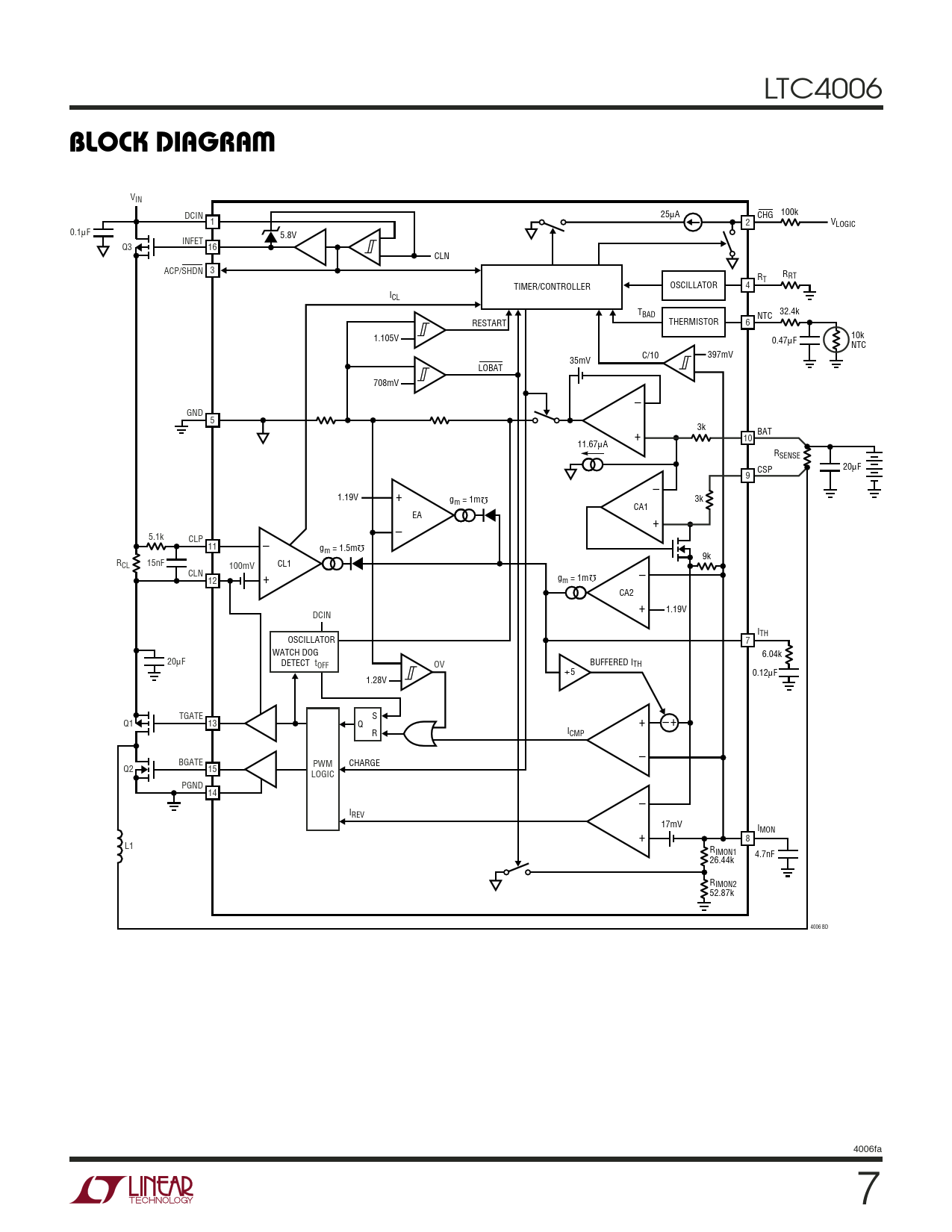 VIN DCIN 25µA CHG 100k 1 2 VLOGIC 0.1µF 5.8V INFET Q3 16 CLN ACP/SHDN 3 R R T RT TIMER/CONTROLLER OSCILLATOR 4 ICL T 32.4k BAD NTC RESTART THERMISTOR 6 10k 1.105V 0.47µF NTC C/10 397mV 35mV LOBAT 708mV – GND 5 3k + BAT 10 11.67µA RSENSE CSP 20µF – 9 1.19V + Ω gm = 1m 3k CA1 EA + – 5.1k CLP Ω 11 – gm = 1.5m 9k R 15nF CL 100mV CL1 CLN Ω g 12 + – m = 1m CA2 + 1.19V DCIN ITH OSCILLATOR 7 WATCH DOG 6.04k 20µF DETECT tOFF OV BUFFERED ITH ÷5 0.12µF 1.28V TGATE S + Q1 13 Q – + R ICMP – BGATE PWM CHARGE Q2 15 LOGIC PGND 14 – IREV 17mV IMON + 8 L1 RIMON1 4.7nF 26.44k RIMON2 52.87k 4006 BD 4006fa 7