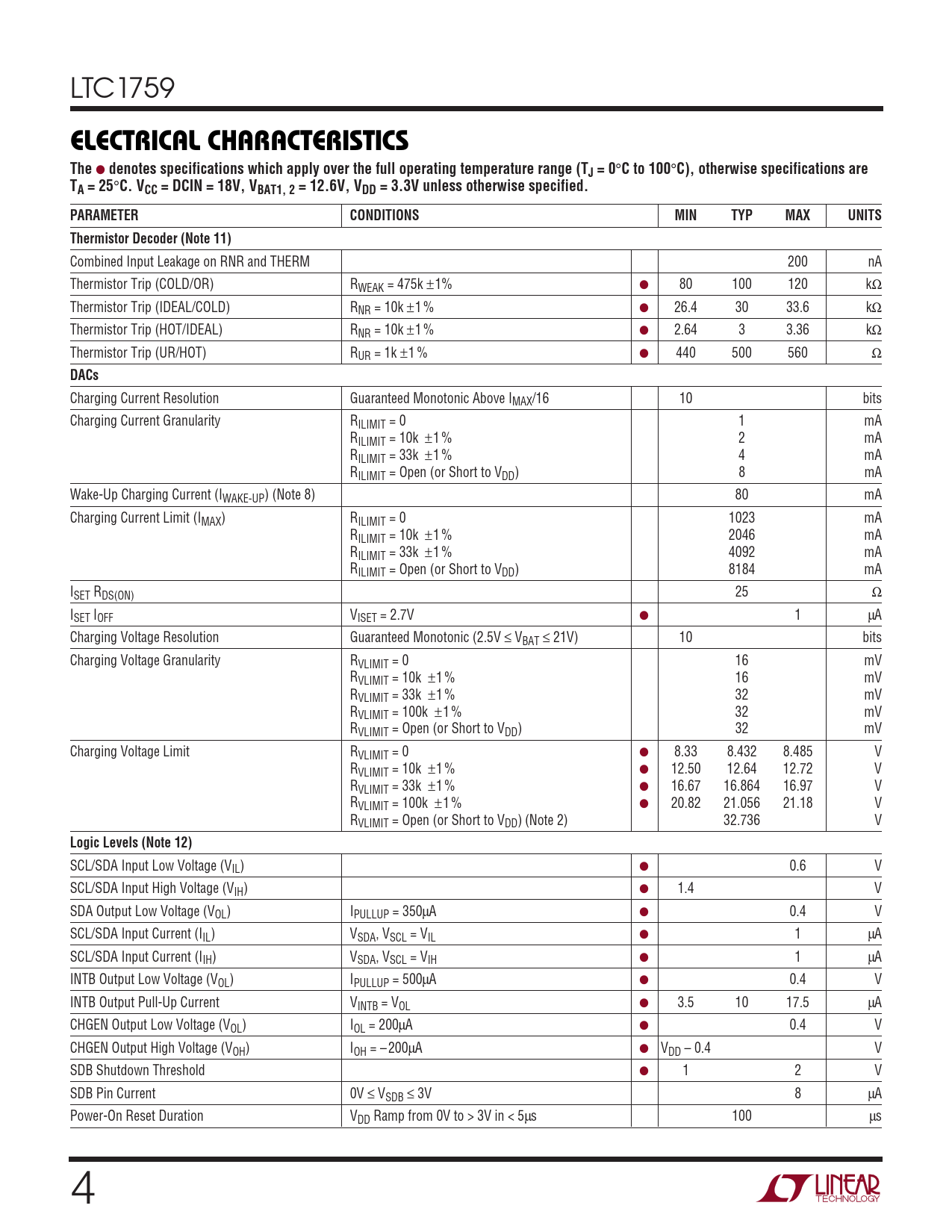 C. VCC = DCIN = 18V, VBAT1, 2 = 12.6V, VDD = 3.3V unless otherwise specified. PARAMETER CONDITIONS MIN TYP MAX UNITS Thermistor Decoder (Note 11)