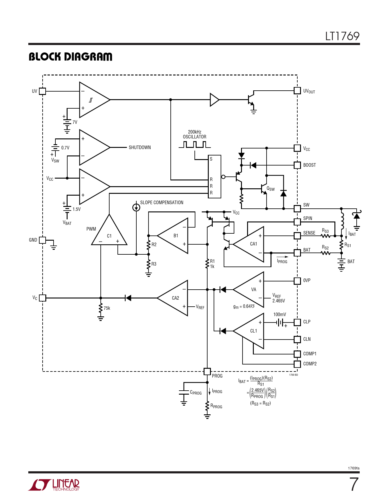 – UV UVOUT + + 7V 200kHz + OSCILLATOR 0.7V SHUTDOWN VCC + – V S SW BOOST – VCC R R Q + SW R + SLOPE COMPENSATION SW 1.5V VCC SPIN VBAT – PWM R SENSE S3 I C1 B1 + BAT GND + – + R2 CA1 R R S1 S2 – BAT R1 IPROG BAT R3 1k + 0VP – VA V V REF C CA2 – + 2.465V Ω V 75k REF gm = 0.64 100mV + CLP + CL1 – CLN COMP1 COMP2 1769 BD PROG (I I PROG)(RS2) BAT = RS1 I R C PROG 2.465V S2 ( )( ) PROG = RPROG RS1 (R R S3 = RS2) PROG 1769fa 7