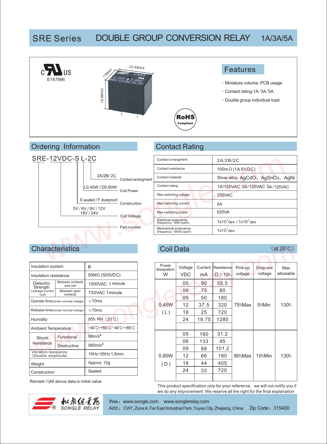 SRE. Series. DOUBLE. GROUP. CONVERSION. RELAY. 1A/3A/5A. 22.6MAX. C. US. X. Features. A. 17M. E167996. ·Miniature. volume,. PCB. usage. X. A. ·Contact