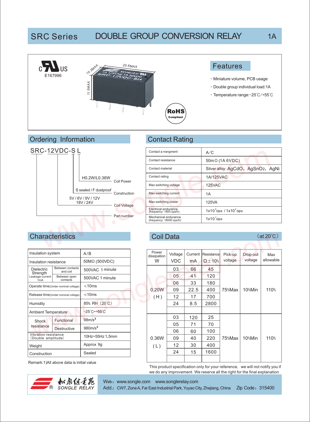 SRC Series DOUBLE GROUP CONVERSION RELAY 1A C US 20.6MAX AX Features 10.2M E167996 ·Miniature volume, PCB usage X A M ·Double group individual load:1A .5 1 1 ·Temperature range:-25℃/+55℃ Ordering Information Contact Rating SRC-12VDC-S L Contact a rrangment A/C Contact resistance 50mΩ (1A 6VDC) Contact material Silver alloy:AgCdO、AgSnO2、AgNi H0.2W/L0.36W Contact rating 1A/125VAC Coil Power Max switching voltage 125VAC S sealed / F dustproof Construction Max switching current 1A 5V / 6V / 9V / 12V 18V / 24V Max switching power 125VA Coil Voltage Electrical endurance (frequency: 1800 ops/h) 1x10 5ops / 1x10 4 ops Part number endurance Mechanical 1x10 o 7 ps (frequency: 18000 ops/h) Characteristics Coil Data ( 20 at ℃) Insulation system A / B Power Voltage Current Resistance dissipation Pick-up Drop-out Max Insulation resistance 50MΩ (500VDC) W VDC mA ± Ω 10% voltage voltage allowable nim Dielectric Between contacts 500VAC 1 minute 03 66 45 Strength and coil Leakage current Between open 500VAC 1 minute 05 41 120 1mA contacts 06 33 180 Operate time(Under nominal voltage) ≤10ms 0.20W 09 22.5 400 75%Max 10%Min 110% Release time(Under nominal voltage) ≤10ms ( H ) 12 17 700 Humidity 85% RH(20℃) 24 8.5 2800 - Ambient Temperature 25℃~+55℃ 03 120 25 Functional 98m/s ² Shock 05 71 70 resistance Destructive 980m/s ² 06 60 100 Vibration resistance 10Hz ~ 55Hz 1 . 5mm ( Double amplitude) 0.36W 09 40 220 75%Max 10%Min 110% Approx 9g Weight ( L ) 12 30 400 Construction Sealed 24 15 1600 Remark:1)All above data is initial value This product specification only for your reference, we will not notify you if we do any improvement.We reserve all the right for the final explanation Web:www.songle.com www.songlerelay.com Email:sale@songle.com Web:www.songle.com www.songlerelay.com Add.:CW7, Zone A, Far East Industrial Park, Yuyao City, Zhejiang, China i Z p Code:315400 Add.:CW7, Zone A, Far East Industrial Park, Yuyao City, Zhejiang, China Zip Code:315400 Tel.: +86 574 62717777 62762658 62721968 a F x:+86 574 62721978 Document Outline 页 1 页 2