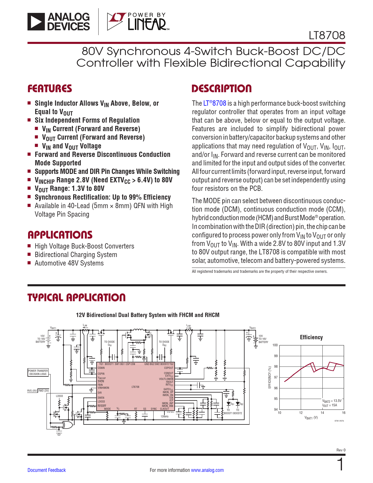 LT8708 80V Synchronous 4-Switch Buck-Boost DC/DC Controller with Flexible Bidirectional Capability