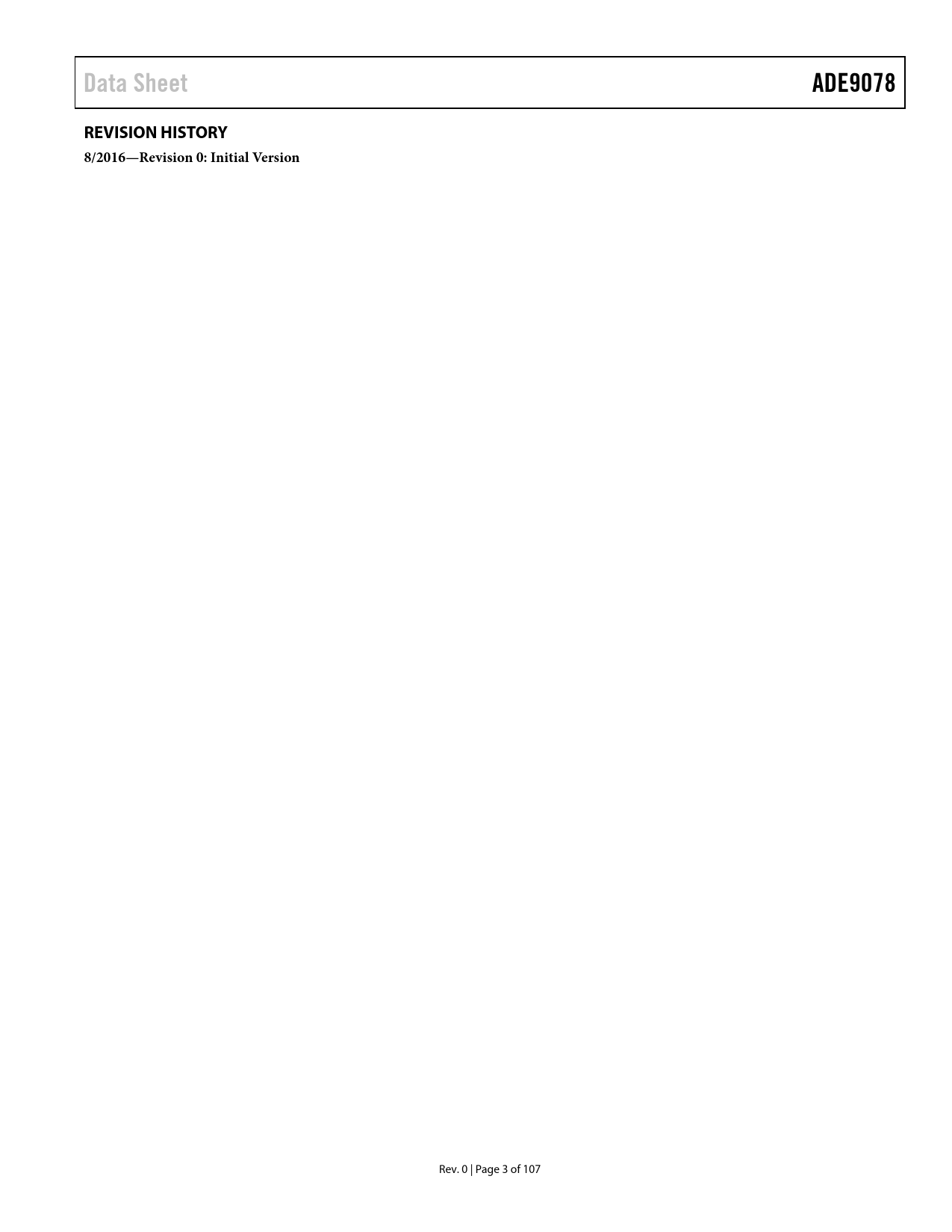 Data SheetADE9078REVISION HISTORY8/2016—Revision 0: Initial Version Rev. 0 | Page 3 of 107 Document Outline FEATURES APPLICATIONS GENERAL DESCRIPTION FUNCTIONAL BLOCK DIAGRAM TABLE OF CONTENTS REVISION HISTORY SPECIFICATIONS TIMING CHARACTERISTICS ABSOLUTE MAXIMUM RATINGS THERMAL RESISTANCE ESD CAUTION PIN CONFIGURATION AND FUNCTION DESCRIPTIONS TYPICAL PERFORMANCE CHARACTERISTICS TOTAL ENERGY LINEARITY OVER SUPPLY AND TEMPERATURE FUNDAMENTAL ENERGY LINEARITY WITH FIFTH HARMONIC OVER SUPPLY AND TEMPERATURE TOTAL ENERGY ERROR OVER FREQUENCY RMS LINEARITY OVER TEMPERATURE AND RMS ERROR OVER FREQUENCY ENERGY LINEARITY REPEATABILITY TOTAL ENERGY AND RMS LINEARITY WITH INTEGRATOR ON TOTAL ENERGY ERROR OVER FREQUENCY WITH INTEGRATOR ON TEST CIRCUIT TERMINOLOGY THEORY OF OPERATION ADC Overview Analog Input Configuration Fully Differential Inputs Interfacing to Current and Voltage Sensors Internal RF Immunity Filter Modes of Operation Output Data Rates and Format Voltage Reference CRYSTAL OSCILLATOR/EXTERNAL CLOCK Crystal Selection Load Capacitor Calculation Load Capacitor Calculation Example POWER MANAGEMENT Power Modes Power-On Sequence Brownout Detection Reset Changing to PSM2 or PSM3 MEASUREMENTS (NORMAL MODE) Current Channel Current Channel Measurement Update Rates ADC_REDIRECT Multiplexer Current Channel Gain, xIGAIN IB Calculation Using ICONSEL High-Pass Filter Digital Integrator Phase Compensation Multipoint Gain and Phase Calibration Multipoint Gain and Phase Single-Point Gain and Phase Voltage Channel Voltage Channel Measurements Voltage Channel Gain Energy Measurements Overview Per Phase Energy Measurements Update Rate Power-Based and Filter-Based RMS Measurement Algorithms Filter-Based Total RMS Neutral Current RMS, RMS of Sum of Instantaneous Currents Total Active Power Total Reactive Power Total Apparent Power Fundamental Reactive Power Power Factor Energy Accumulation Signed Energy Accumulation Modes Total Active Energy Accumulation Modes Reactive Energy Accumulation Modes No Load Detection No Load Indications Energy Accumulation Details Internal Energy Register Overflow Rate User Energy Register Update Rate, EGYRDY Reloading or Accumulating User Energy Register User Energy Register Overflow Rate Accessing the User Energy Registers Read User Energy Register with Reset User Energy Register Use Models Digital to Frequency Conversion—CFx Output Energy and Phase Selection Configuring the Maximum CF Pulse Output Frequency Configuring the CF Pulse Width CFx Pulse Sign Clearing the CFx Accumulator Disabling the CFx Pulse Output and CFx Interrupt MEASUREMENTS (PSM1) Overview IRMS, VRMS, and Active Power VAR PSM1 Startup Flow from PSM2 and PSM3 PSM1 Startup Flow from PSM0 Power Accumulation Power Accumulation Details Accessing the User Power Registers Power Sign Detection Zero-Crossing Detection Combined Voltage Zero Crossing Zero-Crossing Output Rates Zero-Crossing Timeout Line Period Calculation Angle Measurement Phase Sequence Error Detection 4-Wire Wye and 4-Wire Delta 3-Wire Delta Peak Detection MEASUREMENTS (PSM2) Overview Low Power Comparator KEY FEATURES FLEXIBLE WAVEFORM BUFFER WITH RESAMPLING MULTIPOINT PHASE/GAIN CALIBRATION RMS OF SUM OF INSTANTANEOUS CURRENTS MEASUREMENT TAMPER MODES POWER FACTOR ZERO-CROSSING TIMEOUT DETECTION LINE PERIOD MEASUREMENT ANGLE MEASUREMENT PHASE SEQUENCE ERROR DETECTION QUICK START APPLICATIONS INFORMATION NON-BLONDEL COMPLIANT METERS APPLYING THE ADE9078 TO A 4-WIRE WYE SERVICE APPLYING THE ADE9078 TO A 3-WIRE DELTA SERVICE APPLYING THE ADE9078 TO A NON-BLONDEL COMPLIANT, 4-WIRE WYE SERVICE APPLYING THE ADE9078 TO A NON-BLONDEL COMPLIANT, 4-WIRE DELTA SERVICE SERVICE TYPE SUMMARY ACCESSING ON-CHIP DATA SPI PROTOCOL OVERVIEW SPI WRITE SPI READ SPI BURST READ SPI PROTOCOL CRC CRC Algorithm ADDITIONAL COMMUNICATION VERIFICATION REGISTERS CRC OF CONFIGURATION REGISTERS CONFIGURATION LOCK WAVEFORM BUFFER FIXED DATA RATE WAVEFORMS Waveform Buffer Filling Indication—Fixed Data Rate Samples FIXED DATA RATE WAVEFORMS FILLING AND TRIGGER-BASED MODES Stop When Buffer Is Full Mode Continuous Fill Mode Stop Filling on Trigger Center Capture Around Trigger Save Event Address and Keep Filling RESAMPLED WAVEFORMS CONFIGURING THE WAVEFORM BUFFER BURST READ WAVEFORM BUFFER SAMPLES FROM SPI Example 1: Fixed Data Rate Data, Seven Channel Samples Example 2: Resampled Data, Phase C (I and V Samples) Example 3: Fixed Data Rate Data, Single Address Read Mode Example 4: Resampled Data, Single Address Read Mode SPI CRC when Reading the Waveform Buffer SPI Last Data Register when Reading the Waveform Buffer INTERRUPTS/EVENTS INTERRUPTS (IRQ0\ AND IRQ1\) EVENT\ STATUS BITS IN ADDITIONAL REGISTERS No Load TROUBLESHOOTING SPI DOES NOT WORK PSM2_CFG REGISTER VALUE IS NOT RETAINED WHEN GOING FROM PSM2 OR PSM3 TO PSM0 REGISTER INFORMATION REGISTER DETAILS OUTLINE DIMENSIONS ORDERING GUIDE