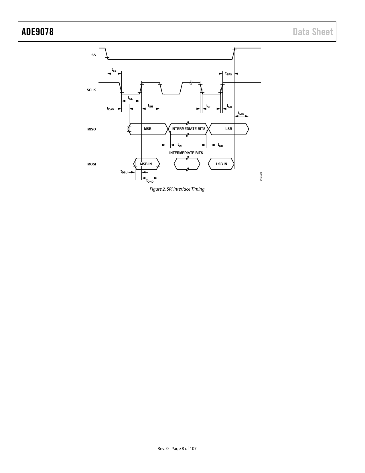 ADE9078. Data Sheet. tSS. tSFS. SCLK. tSL. tSH. tSF. tSR. DAV. tDIS. MISO. MSB. INTERMEDIATE BITS. LSB. tDF. tDR. MOSI. MSB IN. LSB IN. tDSU. tDHD