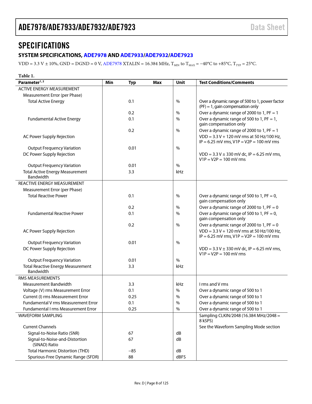 Páginas / Página125 / 8 — ADE7978/ADE7933/ADE7932/ADE7923. Data Sheet. SPECIFICATIONS SYSTEM …