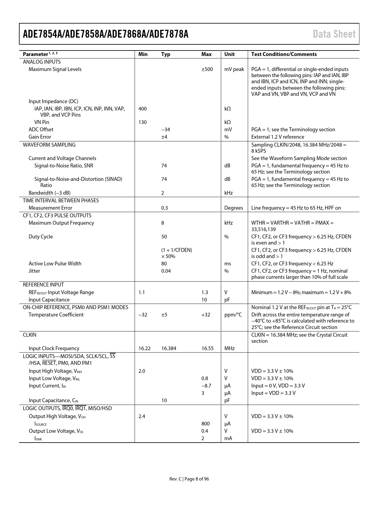 ADE7854A/ADE7858A/ADE7868A/ADE7878A. Data Sheet. Parameter1, 2, 3. Min. Typ. Max. Unit. Test Conditions/Comments
