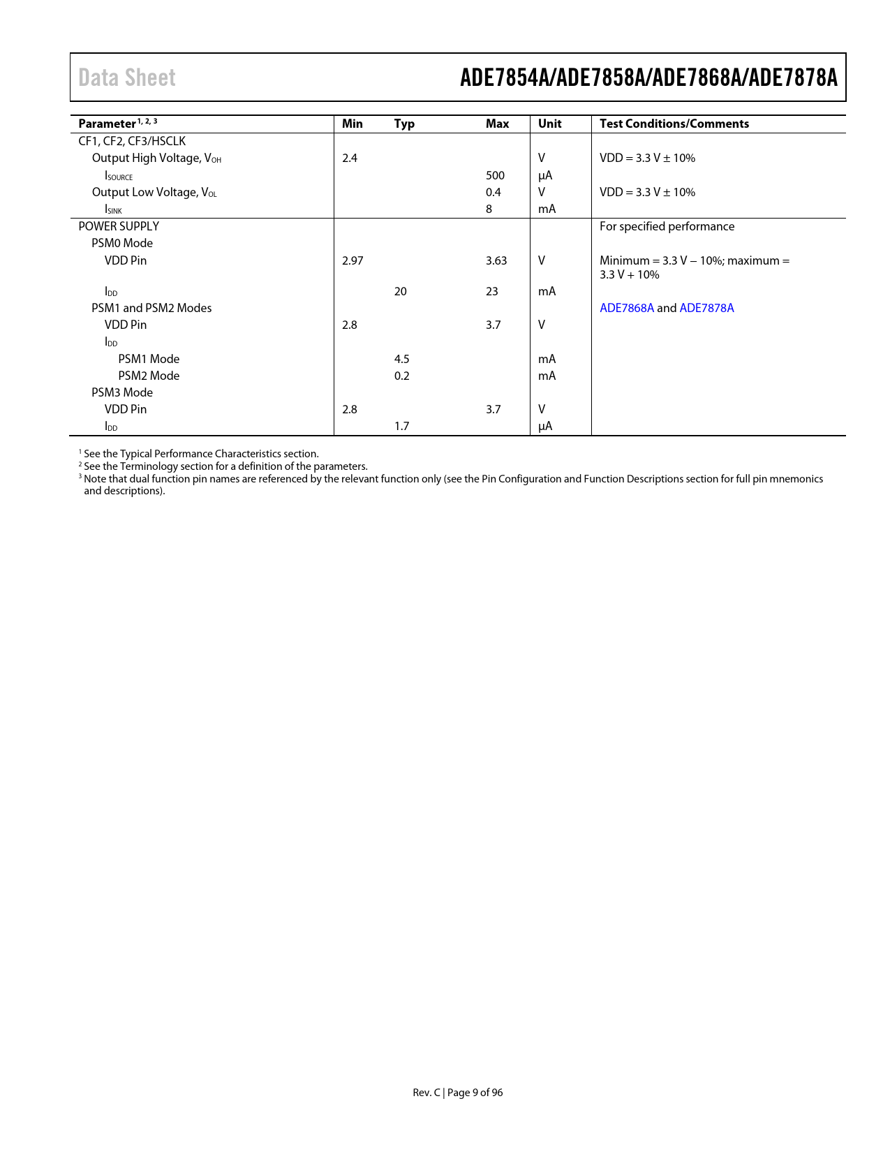 Data Sheet. ADE7854A/ADE7858A/ADE7868A/ADE7878A. Parameter1, 2, 3. Min. Typ. Max. Unit. Test Conditions/Comments