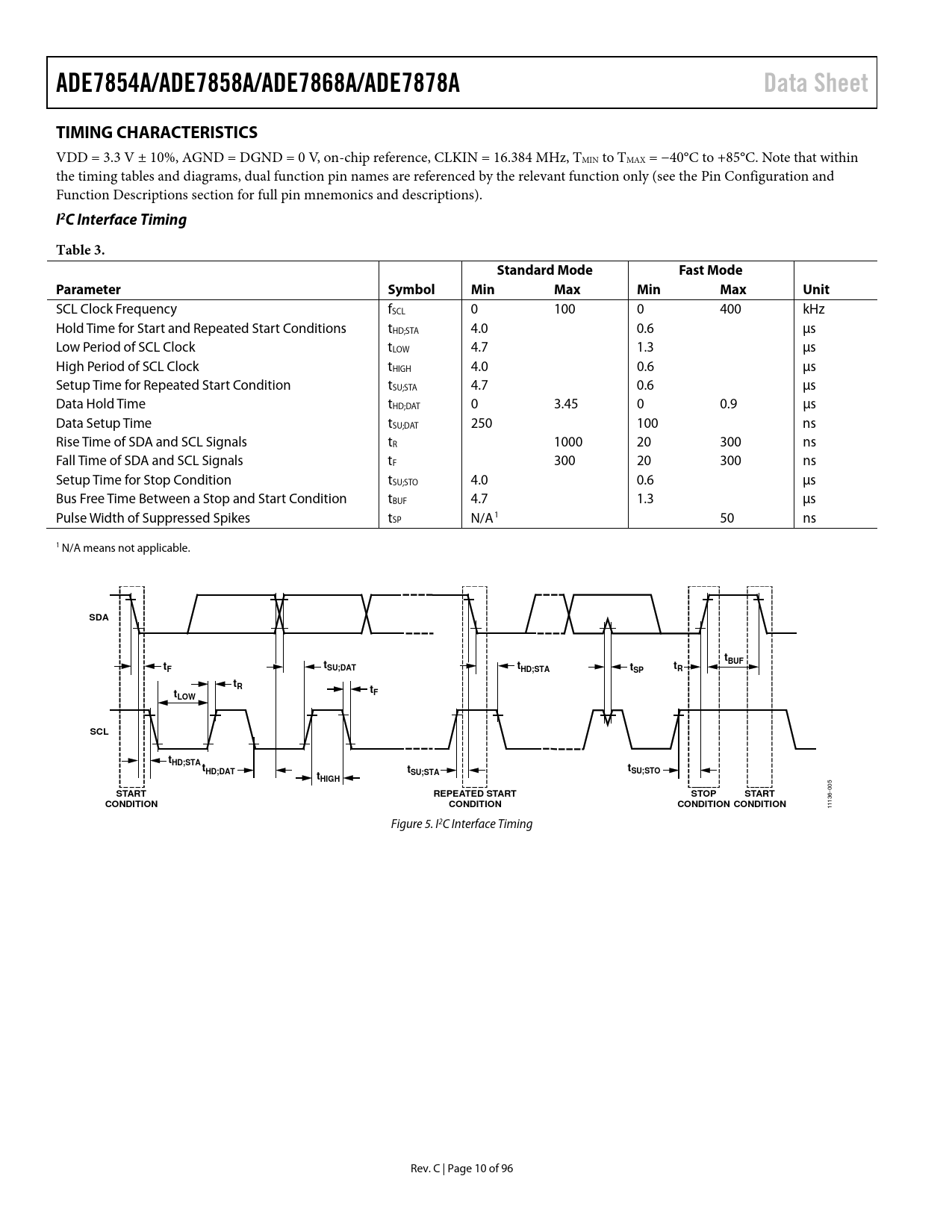 ADE7854A/ADE7858A/ADE7868A/ADE7878A. Data Sheet. TIMING CHARACTERISTICS. I2C Interface Timing. Table 3. Standard Mode. Fast Mode