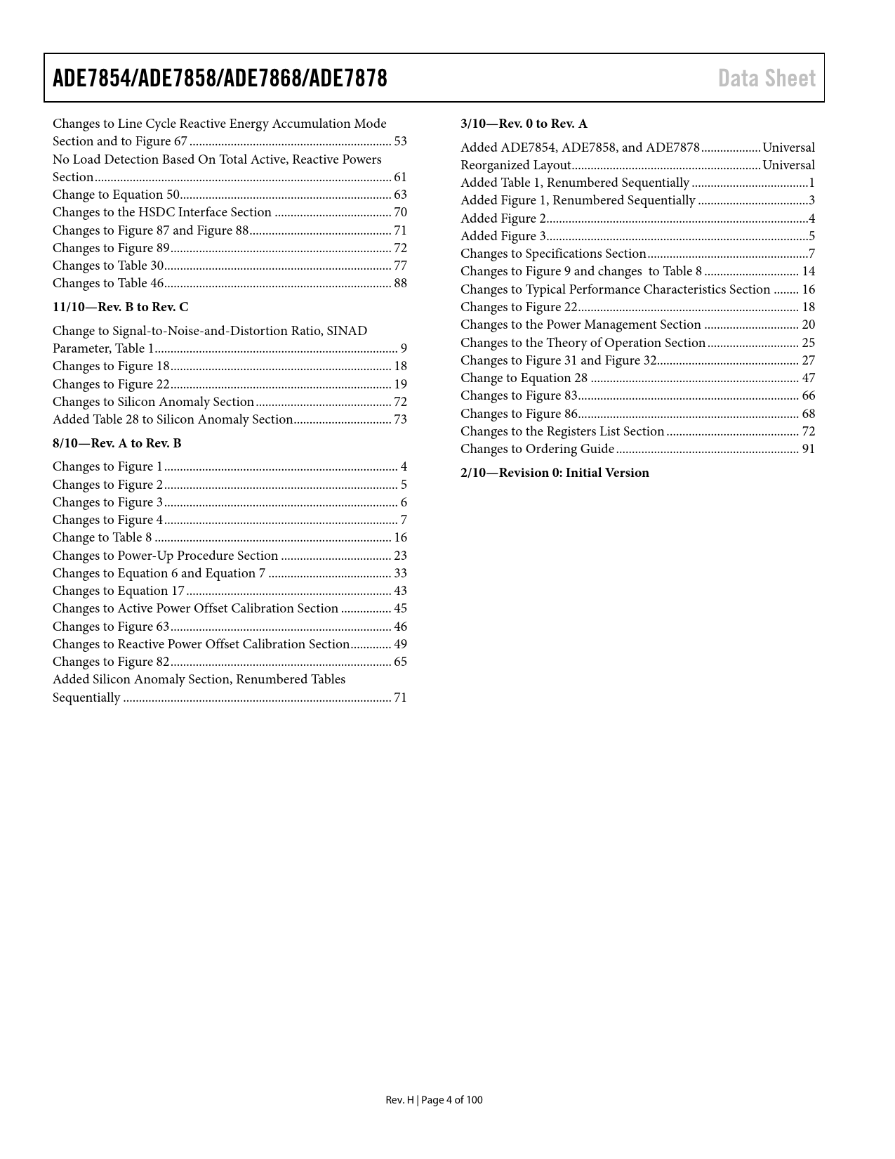 ADE7854/ADE7858/ADE7868/ADE7878Data Sheet Changes to Line Cycle Reactive Energy Accumulation Mode 3/10—Rev. 0 to Rev. A Section and to Figure 67 .. 53 Added ADE7854, ADE7858, and ADE7878 ... Universal No Load Detection Based On Total Active, Reactive Powers Reorganized Layout .. Universal Section .. 61 Added Table 1, Renumbered Sequentially ... 1 Change to Equation 50 ... 63 Added Figure 1, Renumbered Sequentially ... 3 Changes to the HSDC Interface Section ... 70 Added Figure 2 ... 4 Changes to Figure 87 and Figure 88 ... 71 Added Figure 3 ... 5 Changes to Figure 89 .. 72 Changes to Specifications Section ... 7 Changes to Table 30 .. 77 Changes to Figure 9 and changes to Table 8 .. 14 Changes to Table 46 .. 88 Changes to Typical Performance Characteristics Section .. 16 11/10—Rev. B to Rev. C Changes to Figure 22 .. 18 Change to Signal-to-Noise-and-Distortion Ratio, SINAD Changes to the Power Management Section .. 20 Parameter, Table 1 ... 9 Changes to the Theory of Operation Section ... 25 Changes to Figure 18 .. 18 Changes to Figure 31 and Figure 32... 27 Changes to Figure 22 .. 19 Change to Equation 28 .. 47 Changes to Silicon Anomaly Section ... 72 Changes to Figure 83 .. 66 Added Table 28 to Silicon Anomaly Section ... 73 Changes to Figure 86 .. 68 Changes to the Registers List Section .. 72 8/10—Rev. A to Rev. B Changes to Ordering Guide .. 91 Changes to Figure 1 .. 4 2/10—Revision 0: Initial Version Changes to Figure 2 .. 5 Changes to Figure 3 .. 6 Changes to Figure 4 .. 7 Change to Table 8 ... 16 Changes to Power-Up Procedure Section ... 23 Changes to Equation 6 and Equation 7 ... 33 Changes to Equation 17 ... 43 Changes to Active Power Offset Calibration Section .. 45 Changes to Figure 63 .. 46 Changes to Reactive Power Offset Calibration Section ... 49 Changes to Figure 82 .. 65 Added Silicon Anomaly Section, Renumbered Tables Sequentially ... 71 Rev. H | Page 4 of 100 Document Outline Features Applications General Description Table of Contents Revision History Functional Block Diagrams Specifications Timing Characteristics Absolute Maximum Ratings Thermal Resistance ESD Caution Pin Configuration and Function Descriptions Typical Performance Characteristics Test Circuit Terminology Power Management PSM0—Normal Power Mode (All Parts) PSM1—Reduced Power Mode (ADE7868, ADE7878 Only) PSM2—Low Power Mode (ADE7868, ADE7878 Only) PSM3—Sleep Mode (All Parts) Power-Up Procedure Hardcore Reset Software Reset Functionality Theory of Operation Analog Inputs Analog-to-Digital Conversion Antialiasing Filter ADC Transfer Function Current Channel ADC Current Waveform Gain Registers Current Channel HPF Current Channel Sampling di/dt Current Sensor and Digital Integrator Voltage Channel ADC Voltage Waveform Gain Registers Voltage Channel HPF Voltage Channel Sampling Changing Phase Voltage Datapath POWER QUALITY MEASUREMENTS Zero-Crossing Detection Zero-Crossing Timeout Phase Sequence Detection Time Interval Between Phases Period Measurement Phase Voltage Sag Detection SAG Level Set Peak Detection Overvoltage and Overcurrent Detection Overvoltage and Overcurrent Level Set Neutral Current Mismatch—ADE7868, ADE7878 Phase Compensation Reference Circuit Digital Signal Processor Root Mean Square Measurement Current RMS Calculation Current RMS Offset Compensation Current Mean Absolute Value Calculation—ADE7868 and ADE7878 Only Current MAV Gain and Offset Compensation Voltage Channel RMS Calculation Voltage RMS Offset Compensation Active Power Calculation Total Active Power Calculation Fundamental Active Power Calculation—ADE7878 Only Active Power Gain Calibration Active Power Offset Calibration Sign of Active Power Calculation Active Energy Calculation Integration Time Under Steady Load Energy Accumulation Modes Line Cycle Active Energy Accumulation Mode Reactive Power Calculation—ADE7858, ADE7868, ADE7878 Only Reactive Power Gain Calibration Reactive Power Offset Calibration Sign of Reactive Power Calculation Reactive Energy Calculation Integration Time Under A Steady Load Energy Accumulation Modes Line Cycle Reactive Energy Accumulation Mode Apparent Power Calculation Apparent Power Gain Calibration Apparent Power Offset Calibration Apparent Power Calculation Using VNOM Apparent Energy Calculation Integration Time Under Steady Load Energy Accumulation Mode Line Cycle Apparent Energy Accumulation Mode Waveform Sampling Mode Energy-to-Frequency Conversion Synchronizing Energy Registers with CFx Outputs CF Outputs for Various Accumulation Modes Sign of Sum-of-Phase Powers in the CFx Datapath No Load Condition No Load Detection Based On Total Active, Reactive Powers No Load Detection Based on Fundamental Active and Reactive Powers—ADE7878 Only No Load Detection Based on Apparent Power Checksum Register Interrupts Using the Interrupts with an MCU Serial Interfaces Serial Interface Choice I2C-Compatible Interface I2C Write Operation I2C Read Operation SPI-Compatible Interface SPI Read Operation SPI Write Operation HSDC Interface Quick Setup as Energy Meter Layout Guidelines Crystal Circuit ADE7878 Evaluation Board Die Version Silicon Anomaly ADE7854/ADE7858/ADE7868/ADE7878 Functionality Issues Functionality Issues SECTION 1. ADE7854/ADE7858/ADE7868/ADE7878 Functionality Issues Registers List Outline Dimensions Ordering Guide