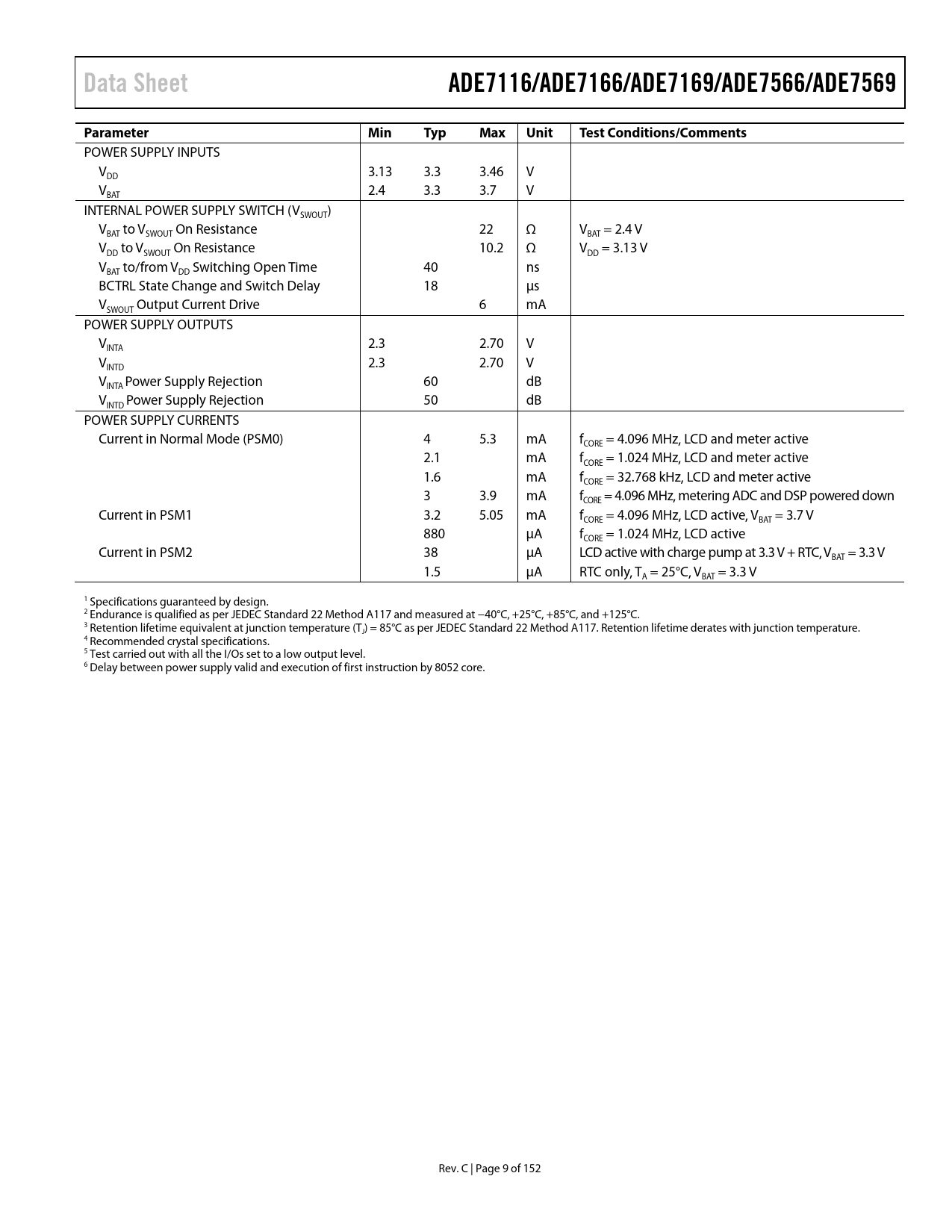 Data SheetADE7116/ADE7166/ADE7169/ADE7566/ADE7569ParameterMinTypMaxUnitTest Conditions/Comments POWER SUPPLY INPUTS V 3.13 3.3 3.46 V DD V 2.4 3.3 3.7 V BAT INTERNAL POWER SUPPLY SWITCH (V ) SWOUT V to V On Resistance 22 Ω V = 2.4 V BAT SWOUT BAT V to V On Resistance 10.2 Ω V = 3.13 V DD SWOUT DD V to/from V Switching Open Time 40 ns BAT DD BCTRL State Change and Switch Delay 18 µs V Output Current Drive 6 mA SWOUT POWER SUPPLY OUTPUTS V 2.3 2.70 V INTA V 2.3 2.70 V INTD V Power Supply Rejection 60 dB INTA V Power Supply Rejection 50 dB INTD POWER SUPPLY CURRENTS Current in Normal Mode (PSM0) 4 5.3 mA f = 4.096 MHz, LCD and meter active CORE 2.1 mA f = 1.024 MHz, LCD and meter active CORE 1.6 mA f = 32.768 kHz, LCD and meter active CORE 3 3.9 mA f = 4.096 MHz, metering ADC and DSP powered down CORE Current in PSM1 3.2 5.05 mA f = 4.096 MHz, LCD active, V = 3.7 V CORE BAT 880 µA f = 1.024 MHz, LCD active CORE Current in PSM2 38 µA LCD active with charge pump at 3.3 V + RTC, V = 3.3 V BAT 1.5 µA RTC only, T = 25°C, V = 3.3 V A BAT 1 Specifications guaranteed by design. 2 Endurance is qualified as per JEDEC Standard 22 Method A117 and measured at −40°C, +25°C, +85°C, and +125°C. 3 Retention lifetime equivalent at junction temperature (TJ) = 85°C as per JEDEC Standard 22 Method A117. Retention lifetime derates with junction temperature. 4 Recommended crystal specifications. 5 Test carried out with all the I/Os set to a low output level. 6 Delay between power supply valid and execution of first instruction by 8052 core. Rev. C | Page 9 of 152 Document Outline GENERAL FEATURES ENERGY MEASUREMENT FEATURES MICROPROCESSOR FEATURES REVISION HISTORY GENERAL DESCRIPTION FUNCTIONAL BLOCK DIAGRAMS SPECIFICATIONS ENERGY METERING ANALOG PERIPHERALS DIGITAL INTERFACE TIMING SPECIFICATIONS ABSOLUTE MAXIMUM RATINGS THERMAL RESISTANCE ESD CAUTION PIN CONFIGURATIONS AND FUNCTION DESCRIPTIONS TYPICAL PERFORMANCE CHARACTERISTICS PERFORMANCE CURVES FOR THE ADE7169 AND ADE7569 ONLY TERMINOLOGY SPECIAL FUNCTION REGISTER (SFR) MAPPING POWER MANAGEMENT POWER MANAGEMENT REGISTER DETAILS Writing to the Interrupt Pins Configuration SFR (INTPR, Address 0xFF) Clearing the Scratch Pad Registers (SCRATCH1, Address 0xFB to SCRATCH4, Address 0xFE) Writing to the Power Control SFR (POWCON, Address 0xC5) POWER SUPPLY ARCHITECTURE BATTERY SWITCHOVER VDD to VBAT Switching from VBAT to VDD POWER SUPPLY MANAGEMENT (PSM) INTERRUPT Battery Switchover and Power Supply Restored PSM Interrupt VDCIN ADC PSM Interrupt VBAT Monitor PSM Interrupt VDCIN Monitor PSM Interrupt SAG Monitor PSM Interrupt USING THE POWER SUPPLY FEATURES OPERATING MODES PSM0 (NORMAL MODE) PSM1 (BATTERY MODE) PSM2 (SLEEP MODE) 3.3 V PERIPHERALS AND WAKE-UP EVENTS TRANSITIONING BETWEEN OPERATING MODES Automatic Battery Switchover (PSM0 to PSM1) Entering Sleep Mode (PSM1 to PSM2) Servicing Wake-Up Events (PSM2 to PSM1) Automatic Switch to VDD (PSM2 to PSM0) USING THE POWER MANAGEMENT FEATURES ENERGY MEASUREMENT ACCESS TO ENERGY MEASUREMENT SFRs ACCESS TO INTERNAL ENERGY MEASUREMENT REGISTERS Writing to the Internal Energy Measurement Registers Reading the Internal Energy Measurement Registers ENERGY MEASUREMENT REGISTERS ENERGY MEASUREMENT INTERNAL REGISTER DETAILS INTERRUPT STATUS/ENABLE SFRs ANALOG INPUTS ANALOG-TO-DIGITAL CONVERSION Antialiasing Filter ADC Transfer Function Current Channel ADC Voltage Channel ADC Channel Sampling FAULT DETECTION Channel Selection Indication Fault Indication Fault with Active Input Greater Than Inactive Input Fault with Inactive Input Greater Than Active Input Calibration Concerns di/dt CURRENT SENSOR AND DIGITAL INTEGRATOR FOR THE ADE7169/ADE7569 POWER QUALITY MEASUREMENTS Zero-Crossing Detection Zero-Crossing Timeout Period or Frequency Measurements Line Voltage SAG Detection SAG Level Set Peak Detection Peak Level Set Peak Level Record PHASE COMPENSATION RMS CALCULATION Current Channel RMS Calculation Current Channel RMS Offset Compensation Voltage Channel RMS Calculation Voltage Channel RMS Offset Compensation ACTIVE POWER CALCULATION Active Power Gain Calibration Active Power Offset Calibration Active Power Sign Detection Active Power No Load Detection ACTIVE ENERGY CALCULATION Integration Time Under Steady Load: Active Energy Active Energy Accumulation Modes Watt Signed Accumulation Mode Watt Positive Only Accumulation Mode Watt Absolute Accumulation Mode Active Energy Pulse Output Line Cycle Active Energy Accumulation Mode REACTIVE POWER CALCULATION (ADE7169/ADE7569) Reactive Power Gain Calibration Reactive Power Offset Calibration Sign of Reactive Power Calculation Reactive Power Sign Detection Reactive Power No Load Detection REACTIVE ENERGY CALCULATION (ADE7169/ADE7569) Integration Time Under Steady Load: Reactive Energy Reactive Energy Accumulation Modes Var Signed Accumulation Mode Var Antitamper Accumulation Mode Var Absolute Accumulation Mode Reactive Energy Pulse Output Line Cycle Reactive Energy Accumulation Mode APPARENT POWER CALCULATION Apparent Power Offset Calibration APPARENT ENERGY CALCULATION Integration Time Under Steady Load: Apparent Energy Apparent Energy Pulse Output Line Apparent Energy Accumulation Apparent Power No Load Detection AMPERE HOUR ACCUMULATION ENERGY TO FREQUENCY CONVERSION Pulse Output Configuration Pulse Output Characteristic ENERGY REGISTER SCALING ENERGY MEASUREMENT INTERRUPTS TEMPERATURE, BATTERY, AND SUPPLY VOLTAGE MEASUREMENTS TEMPERATURE MEASUREMENT Single Temperature Measurement Background Temperature Measurements Temperature ADC in PSM0, PSM1, and PSM2 Temperature ADC Interrupt BATTERY MEASUREMENT Single Battery Measurement Background Battery Measurements Battery ADC in PSM0, PSM1, and PSM2 Modes Battery ADC Interrupt EXTERNAL VOLTAGE MEASUREMENT Single External Voltage Measurement Background External Voltage Measurements External Voltage ADC in PSM0, PSM1, and PSM2 Modes External Voltage ADC Interrupt 8052 MCU CORE ARCHITECTURE MCU REGISTERS BASIC 8052 REGISTERS 