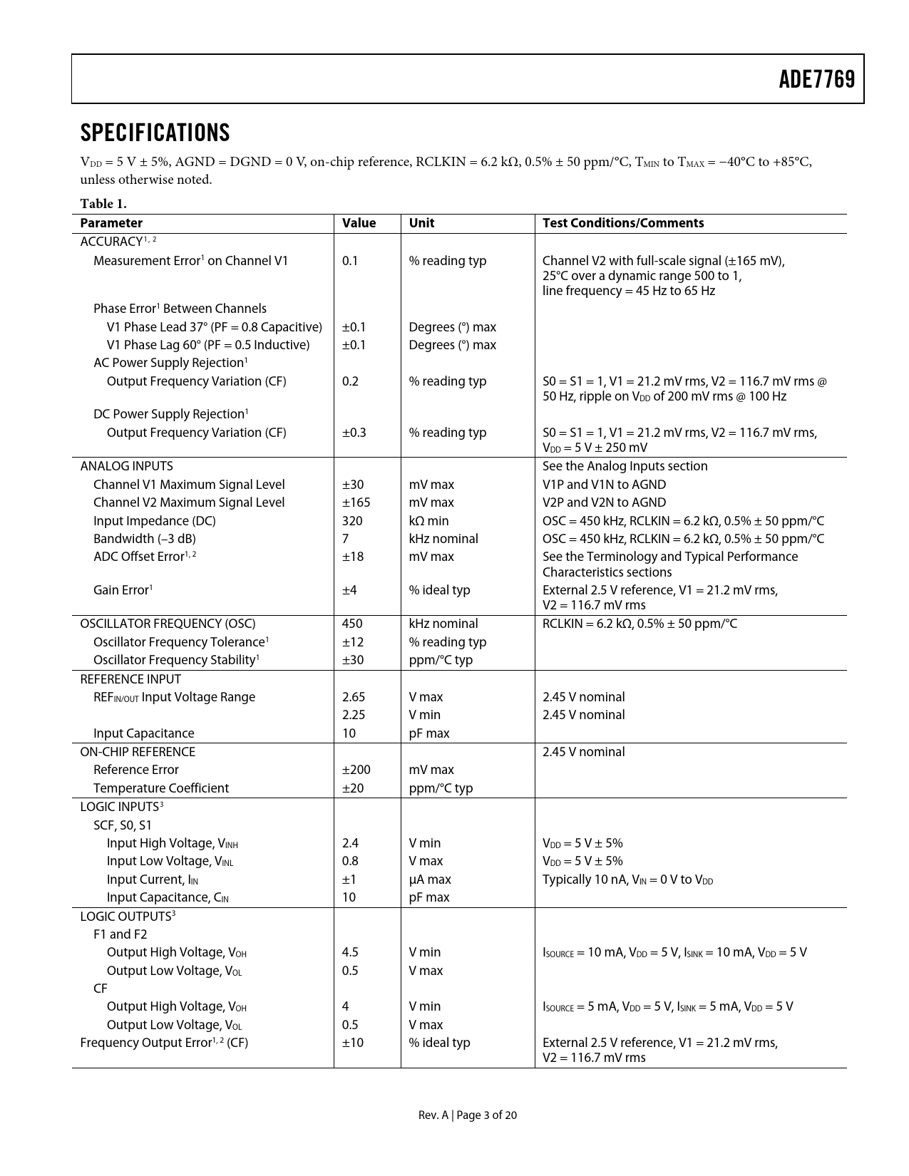ADE7769 SPECIFICATIONS Table 1 Parameter Value Unit Test Conditions/Comments
